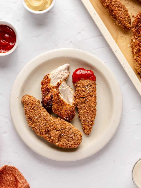 Serve it with your favorite salad and/or sides, or just enjoy it as a protein snack or app, with your dipping sauces of choice – ketchup, BBQ, honey mustard, or a buffalo sauce and ranch if you want to spice it up a bit. One way I like to serve this high-protein chicken is with my Crispy, Buttery Broccolini and Gameday Garlic Fries. Feel free to get creative with it!