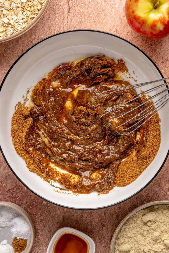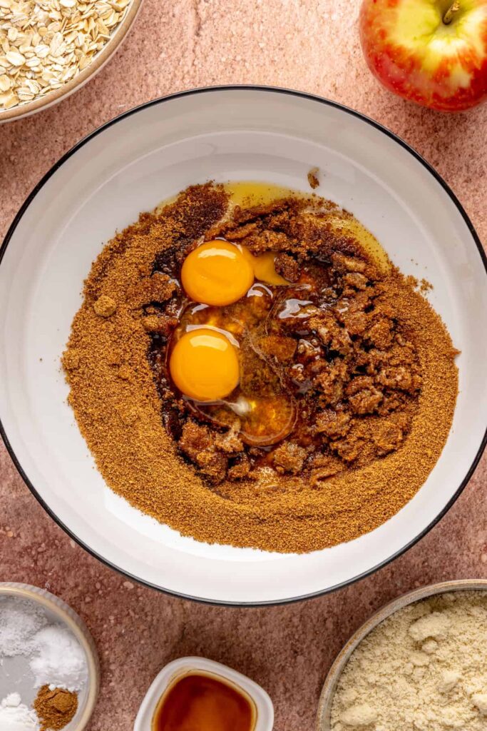 - In a large bowl, add the melted and cooled ghee, egg and egg yolk, coconut sugar, and vanilla extract. Whisk to combine for 30 seconds until smooth. Set aside.