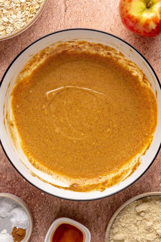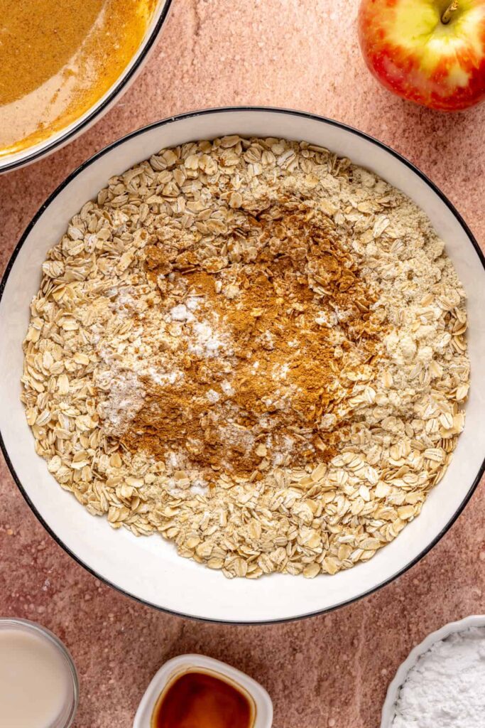- In a separate bowl, add the almond flour, oats, salt, baking powder, baking soda, cinnamon, and nutmeg. Whisk to combine until all the dry ingredients are totally combined.