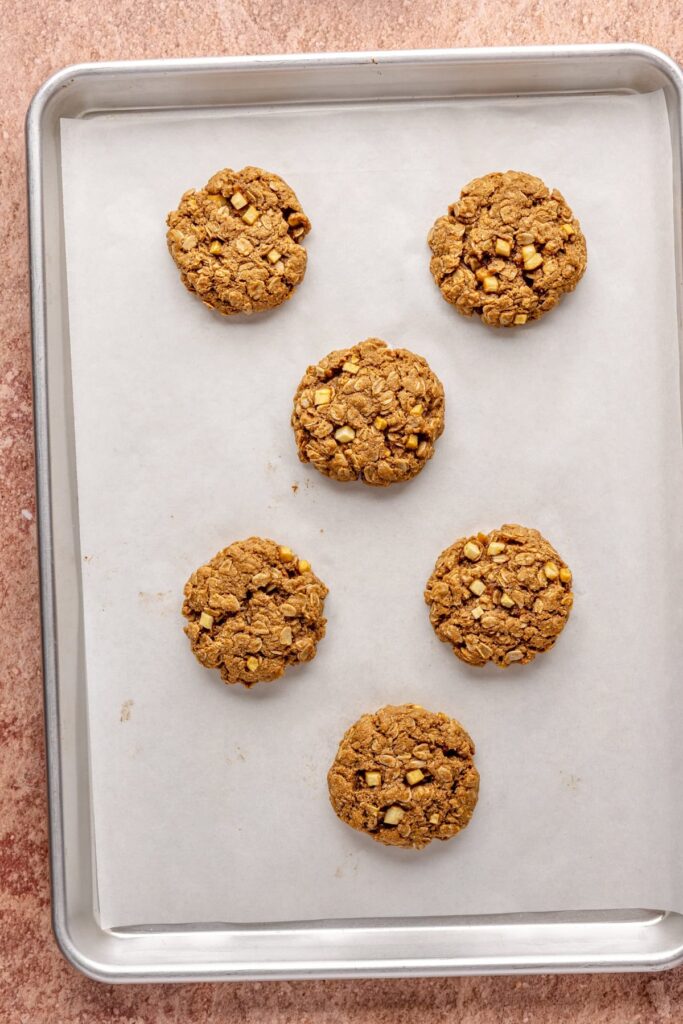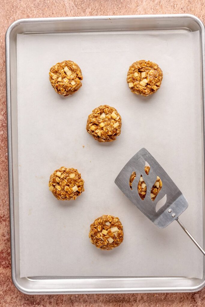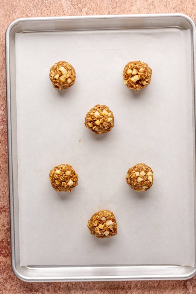 - Remove from the fridge. Using a large cookie scoop, portion into 12-14 large cookies. Roll into balls and place 6 cookies on each sheet, spacing at least 2 inches apart. If any of the apples fall out while forming the cookie, press them into the cookie tops. Gently press the tops down slightly using a spatula.
