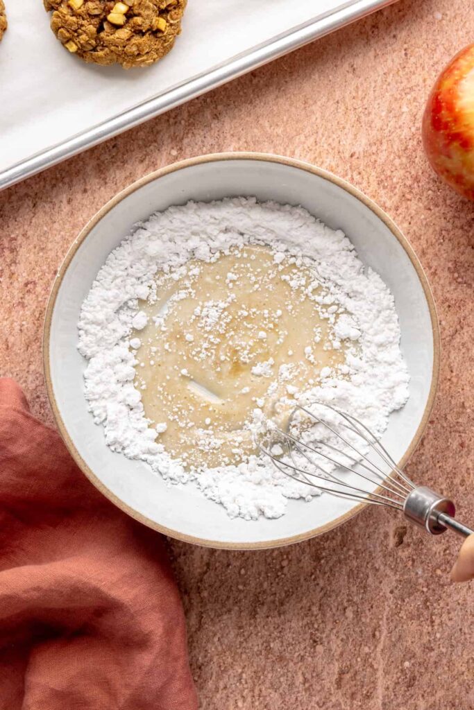 - In a small bowl, add the powdered sugar, almond milk, vanilla extract, cinnamon, and salt. Whisk to combine until smooth and there are no clumps. If the icing is too thick, add the almond milk in 1 teaspoon increments until smooth.