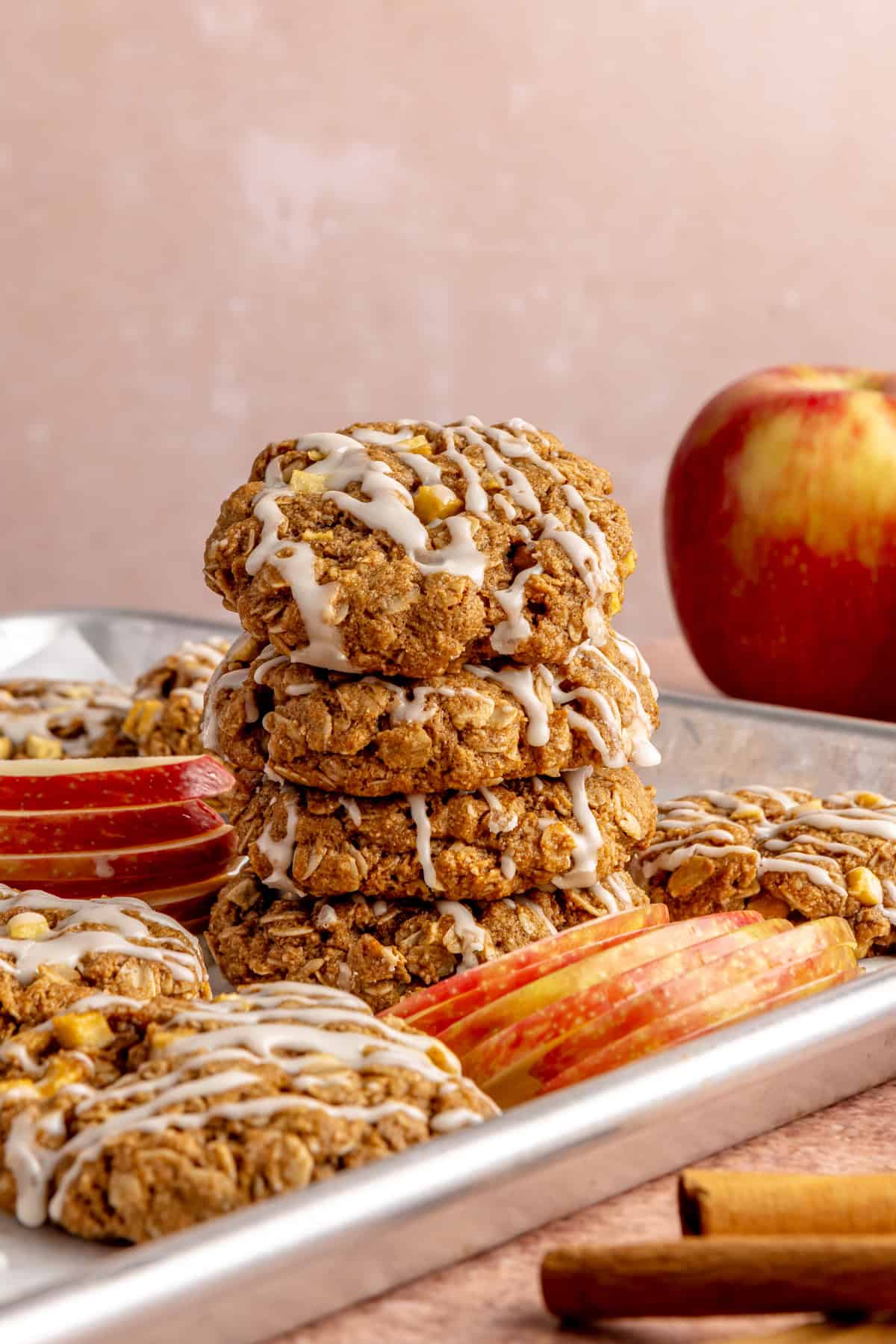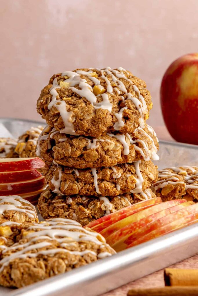 Packed with fall flavors, diced apples, and oats, and topped with a cozy cinnamon glaze, these Apple Spiced Oatmeal Cookies are the perfect cross between a cookie and a muffin. Soft in the middle, crisp on the edges, and naturally sweetened without refined sugar, they make a delicious mid-morning snack or late-night treat.
