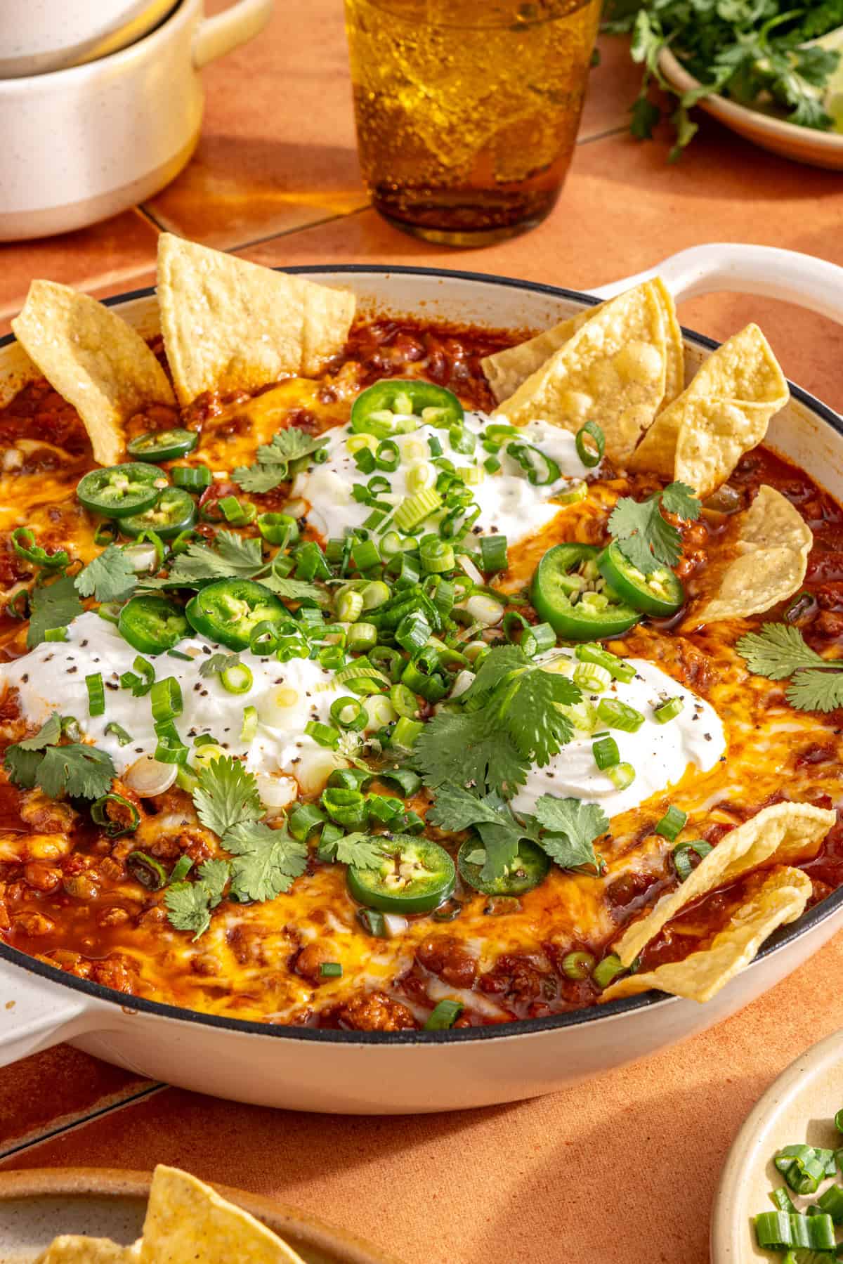 This chili skillet is super versatile. I love serving it with tortilla chips as a dip, but it also works really well over rice, baked potatoes, or spooned into bowls like classic chili. Add toppings like Greek yogurt, shredded cheese, cilantro, green onions, or jalapeños for extra flavor and texture.