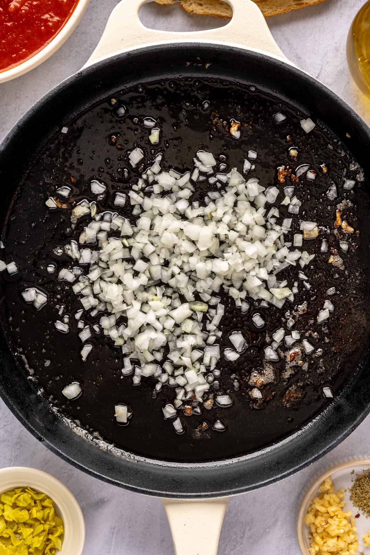 • Once hot, add in the onion. Cook for 3 minutes, or until slightly translucent.