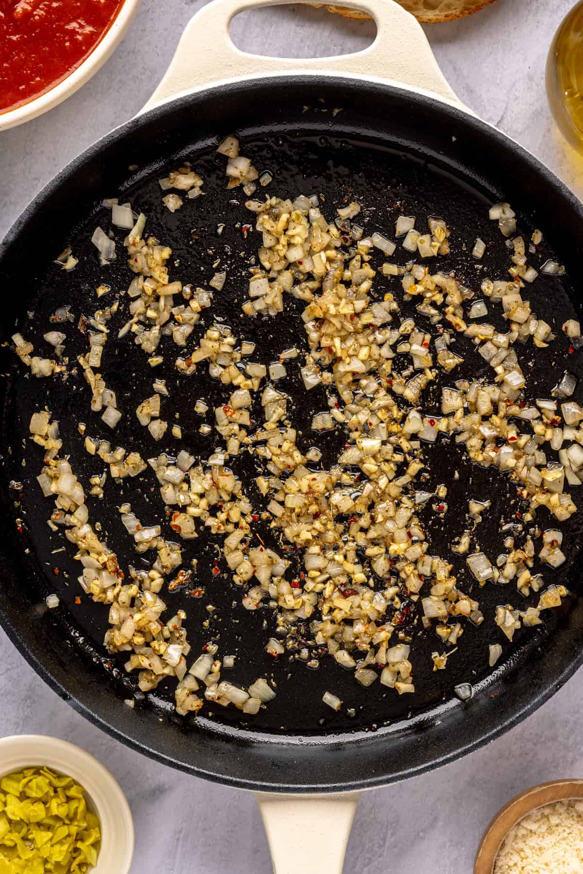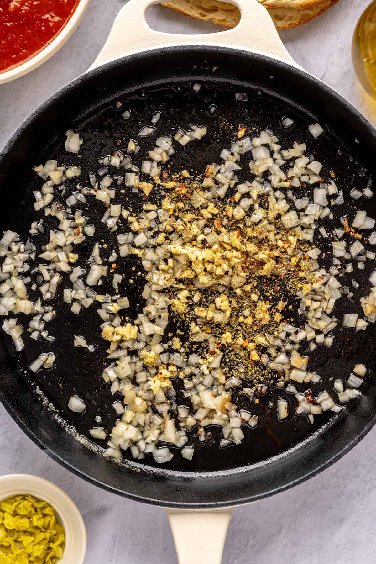 • Add the garlic, dried oregano, and chili flakes. Cook, stirring occasionally, for 1 minute or until the garlic is slightly golden brown.