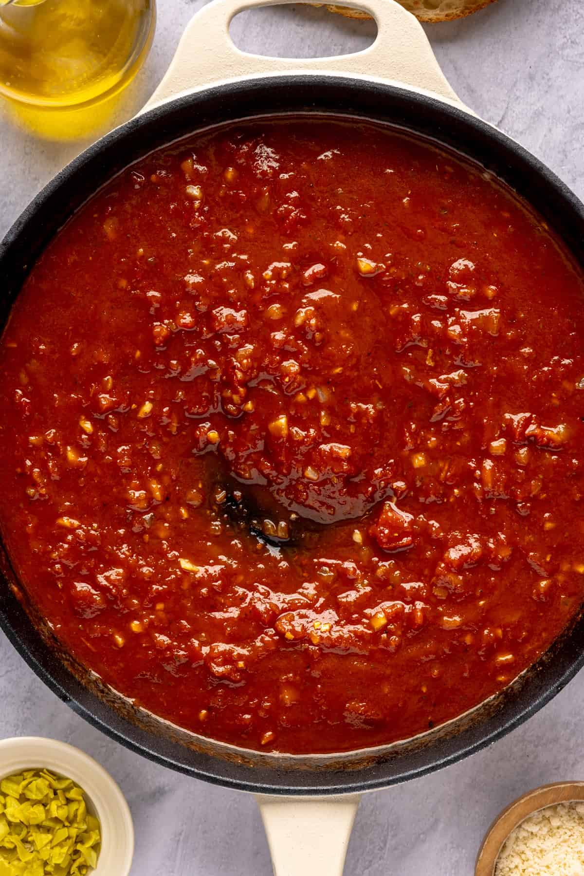Add the meatballs and their juices back to the skillet and nestle them into the sauce. Turn the heat to medium and bring the sauce to a simmer.