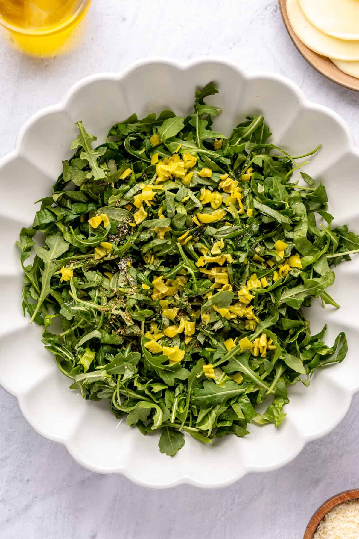 While the sammies are cooling, assemble the greens. In a medium bowl, add the romaine, arugula, olive oil, vinegar, pepperoncini, oregano, salt, pepper, and basil. Toss to combine.