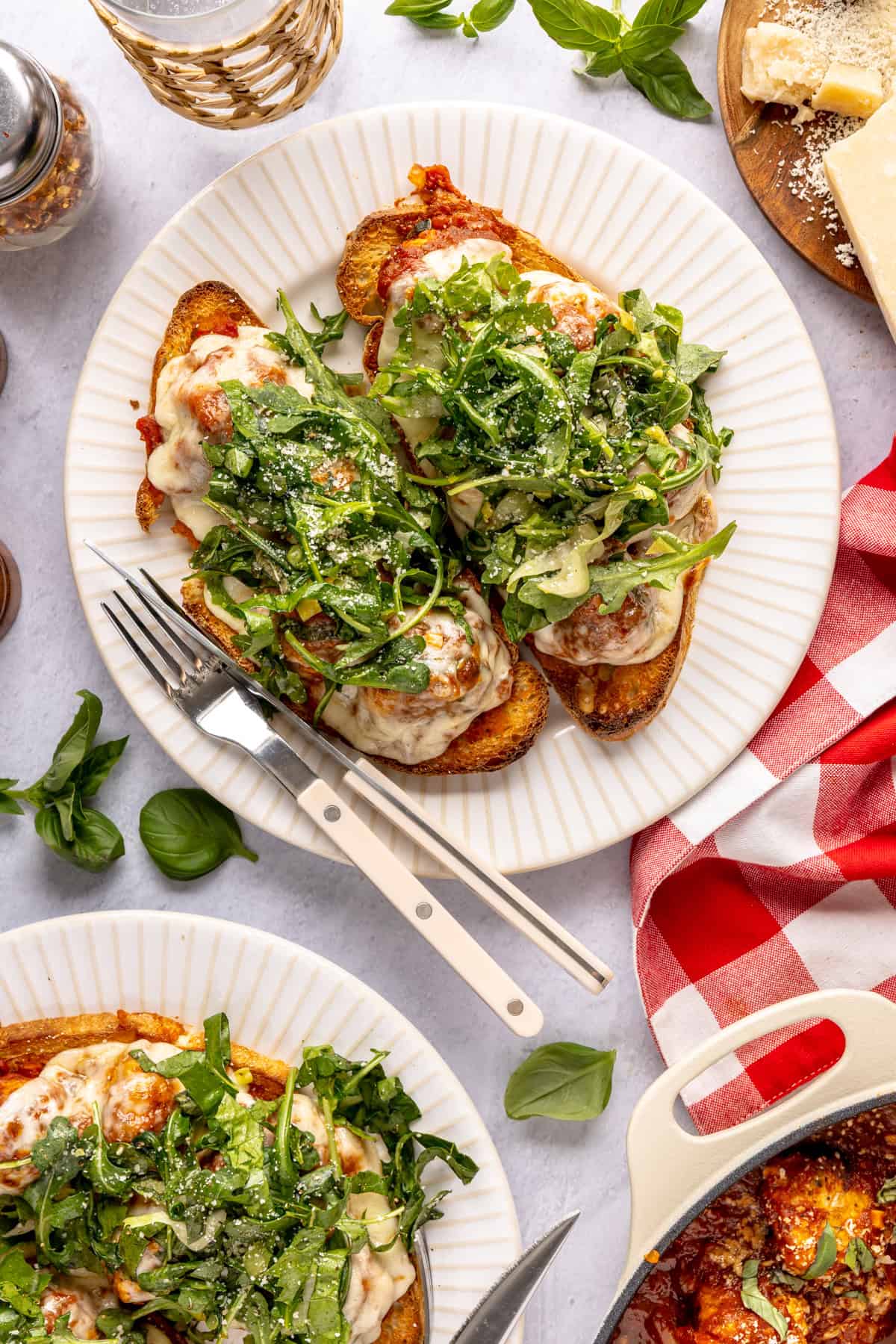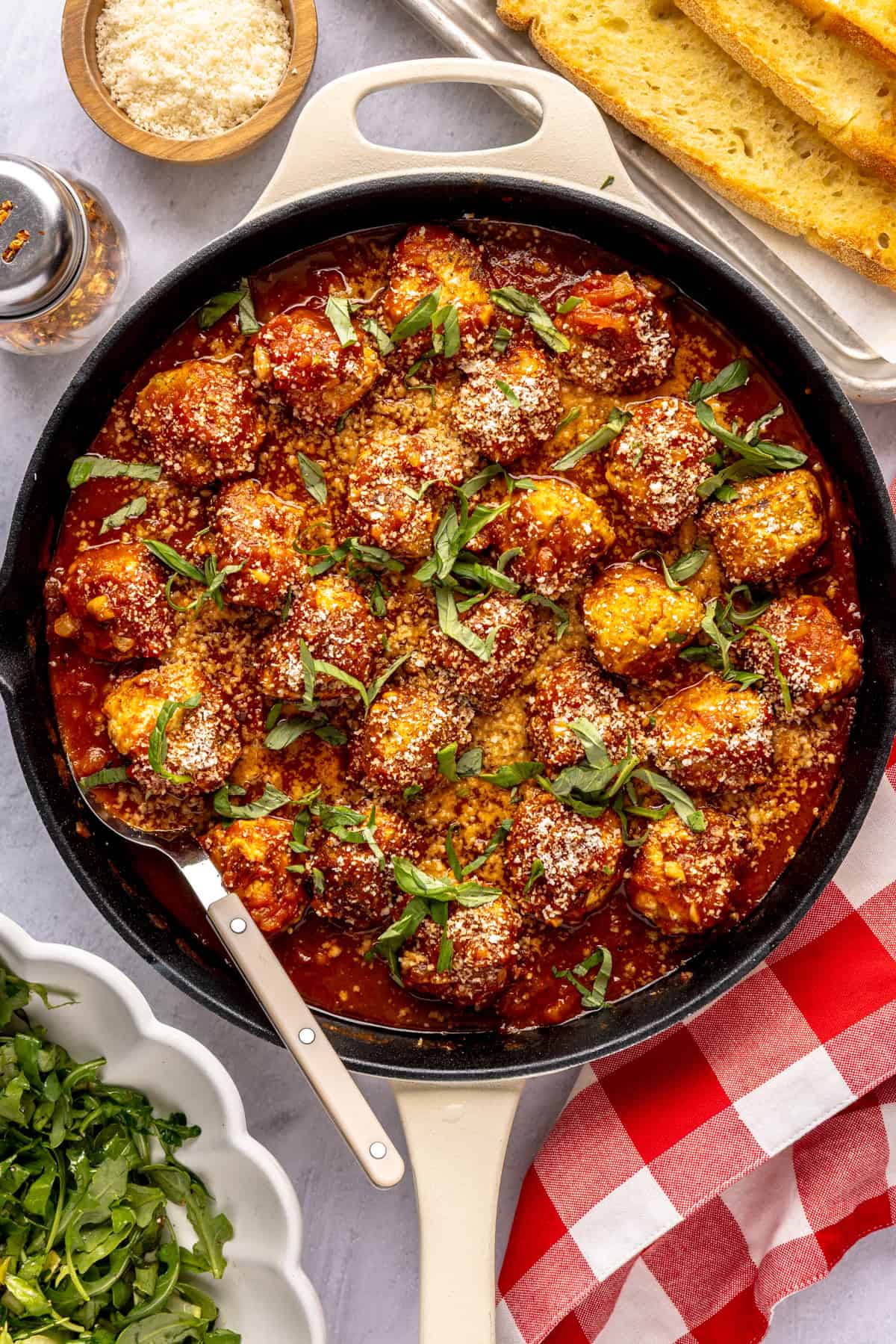 For the subs, use any sturdy bread you like, such as whole-grain, ciabatta, or gluten-free rolls. Swap the greens with spinach, mixed baby greens, or kale if preferred. Finally, reduce or omit crushed red pepper flakes in the meatballs and sauce if you want a milder flavor.