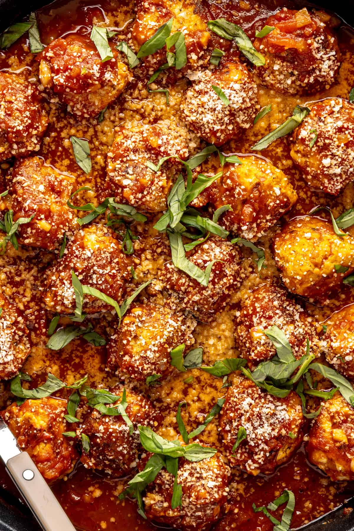 High-protein chicken pesto parmesan meatballs in marinara sauce