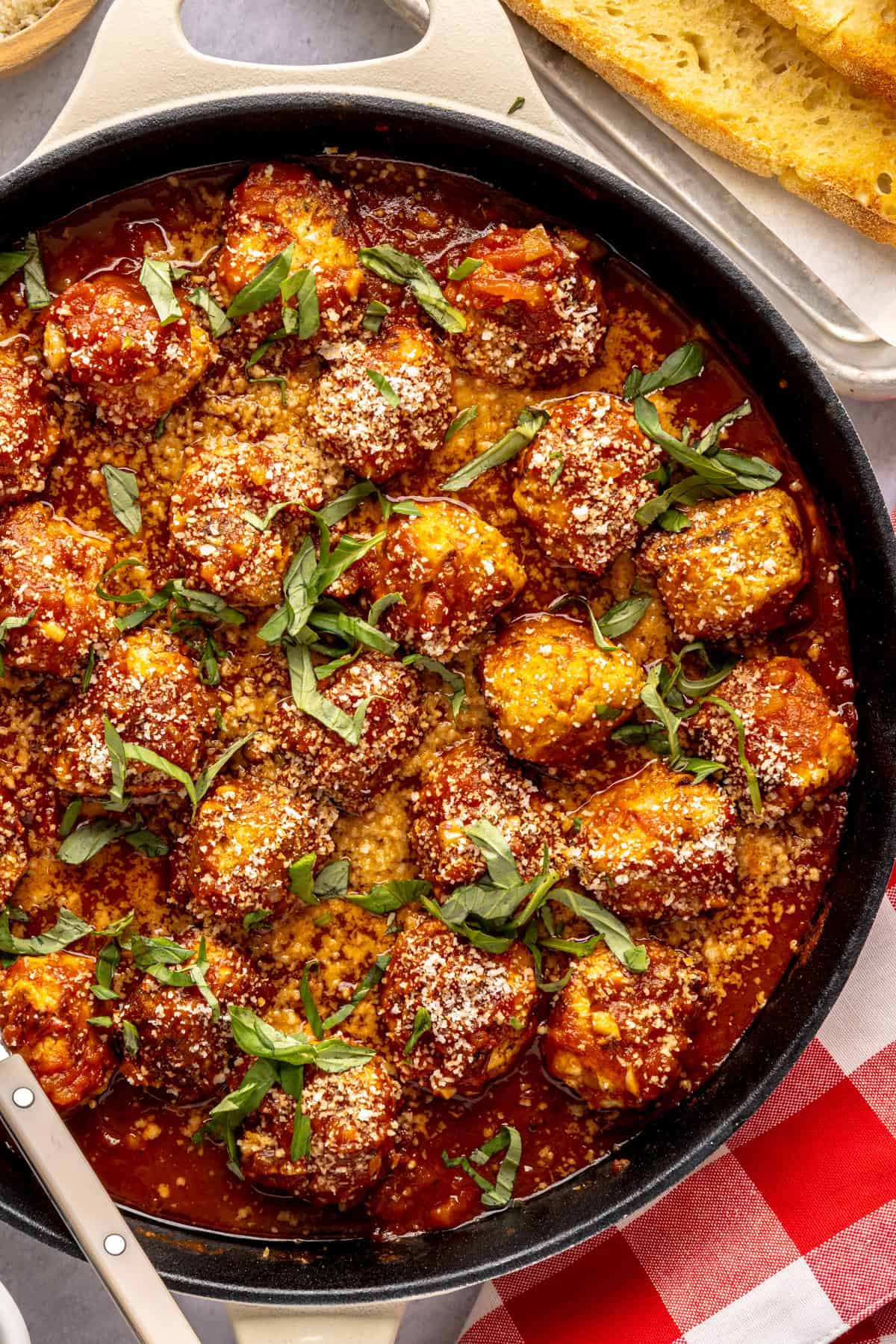 Let the chicken pesto parmesan meatballs cool completely, then transfer them to an airtight container (with or without sauce). Store in the fridge for up to 4 days, or in the freezer for up to 3 months.