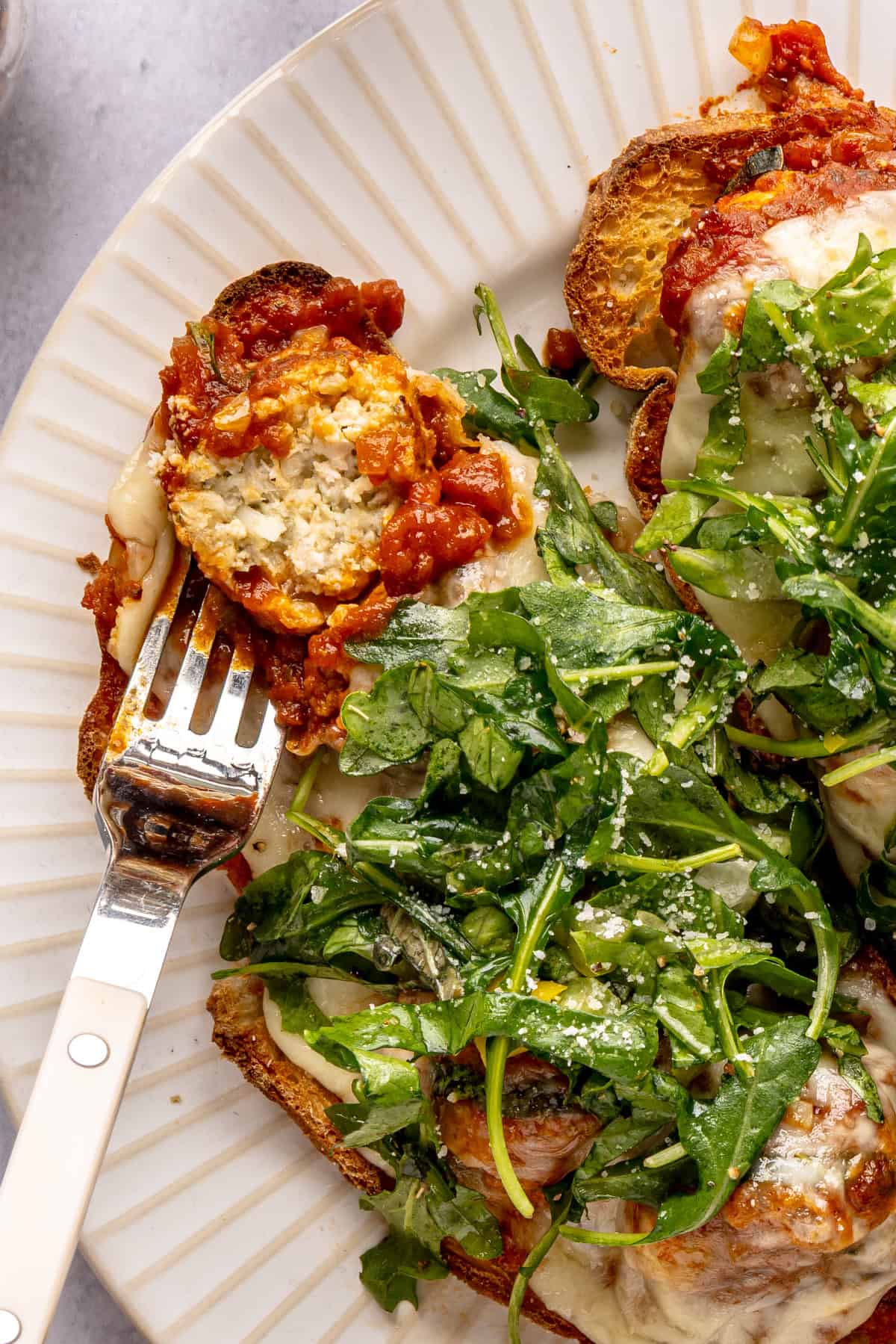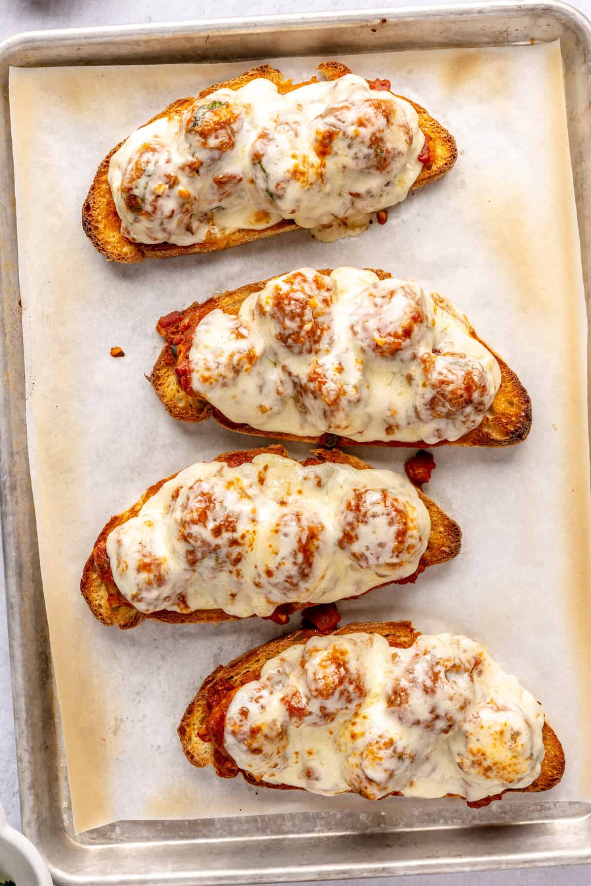 Spread the ghee onto each of the slices of bread. Transfer to the oven and broil for 2 minutes or until golden on one side. Flip so that the golden side is facing up. Add 4-5 meatballs to each slice and spoon extra sauce atop each. Cover each slice with 2 slices of cheese.