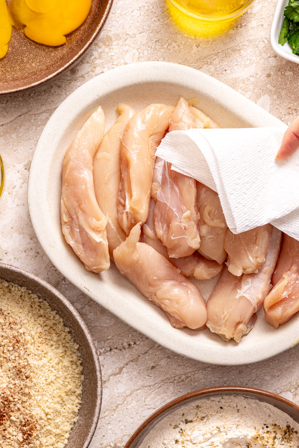 - Prepare the chicken. If using chicken breasts, pound them to an even ¼-inch thickness first. If using tenders, simply pat them dry.