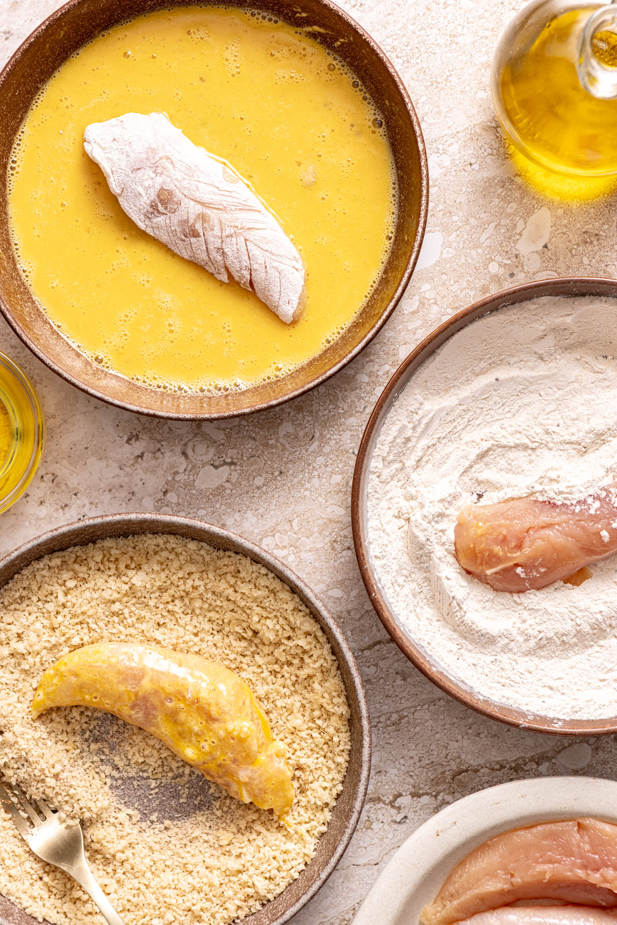 - Working one tender at a time, add the tender to the flour mixture, shaking off any excess, then, using the opposite hand, add it to the egg mixture, allowing excess egg to drip off. Finally, coat in the panko breadcrumbs, shake off the excess, and set on a clean plate. Repeat until all tenders are coated.