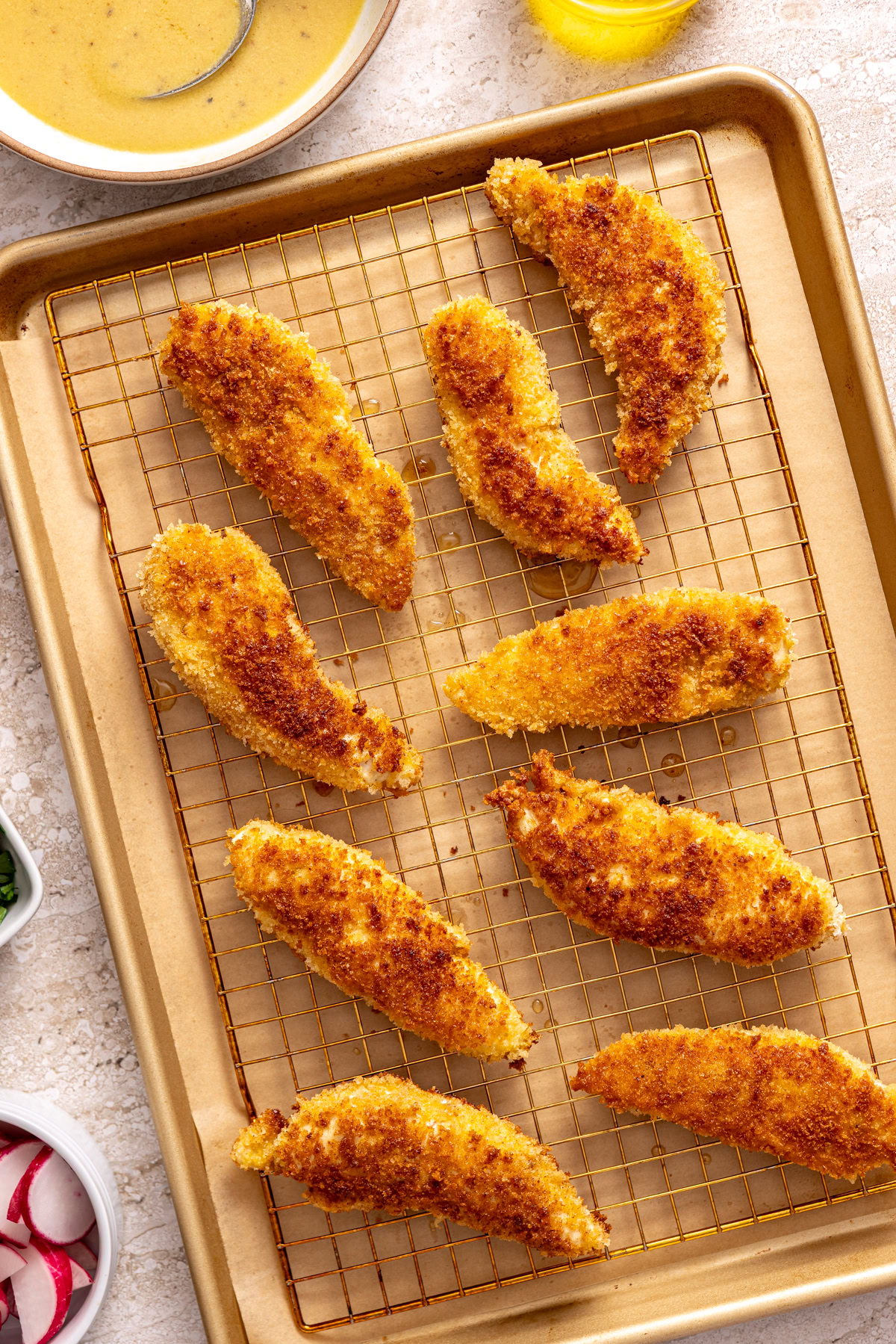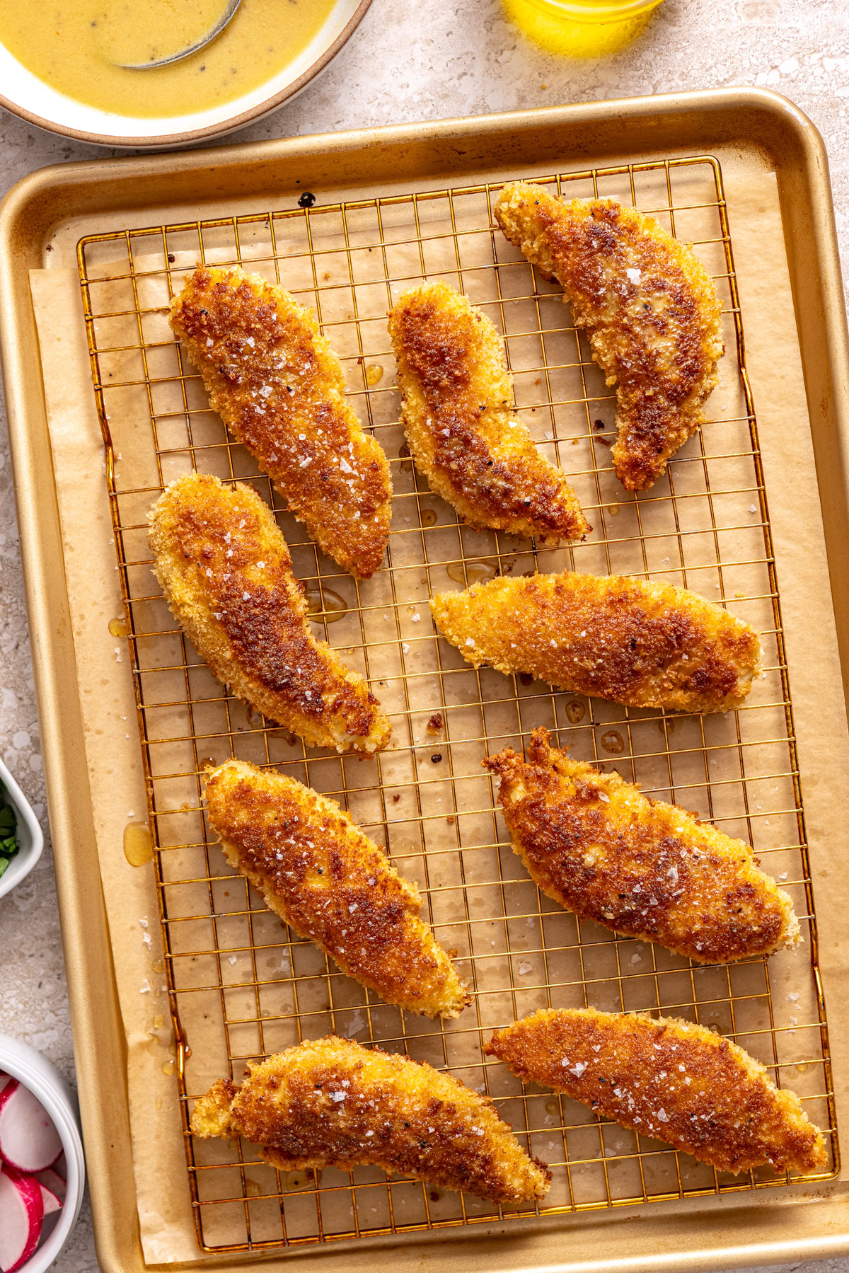 - Transfer to the sheet pan with the wire rack and repeat with the remaining tenders, adding additional oil as needed.