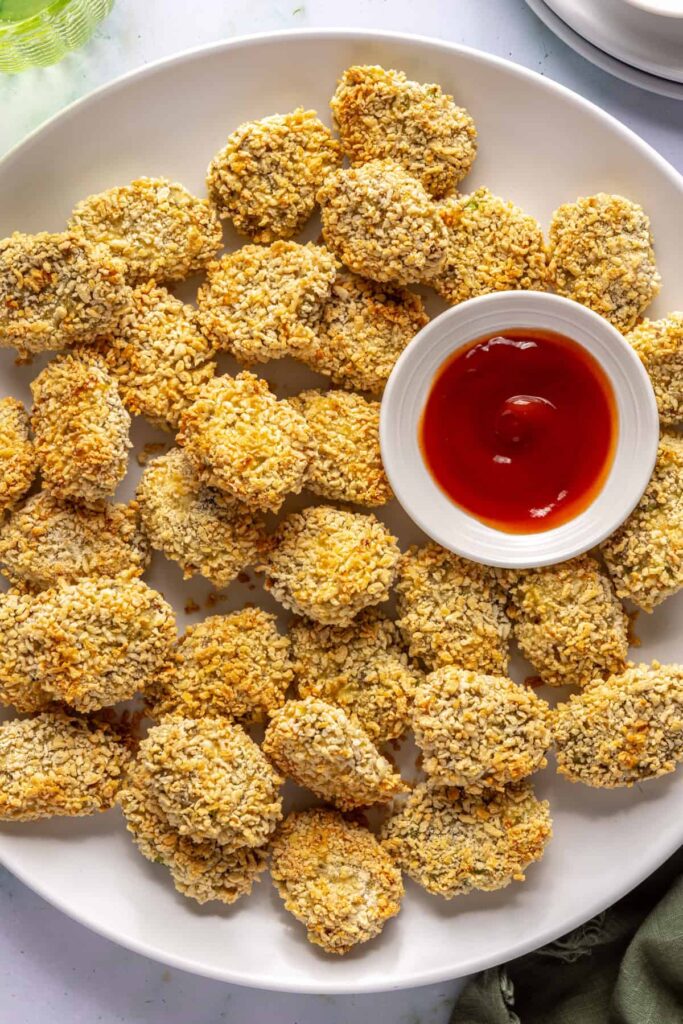 I finally perfected these chicken nuggets and they are crispy, kid-approved, and packed with nutrition. This healthy, baked, no added sugar chicken nuggets recipe sneaks in some steamed broccoli and ground flaxseed, so your little ones are getting fiber, vitamin C, and protein without even realizing it.