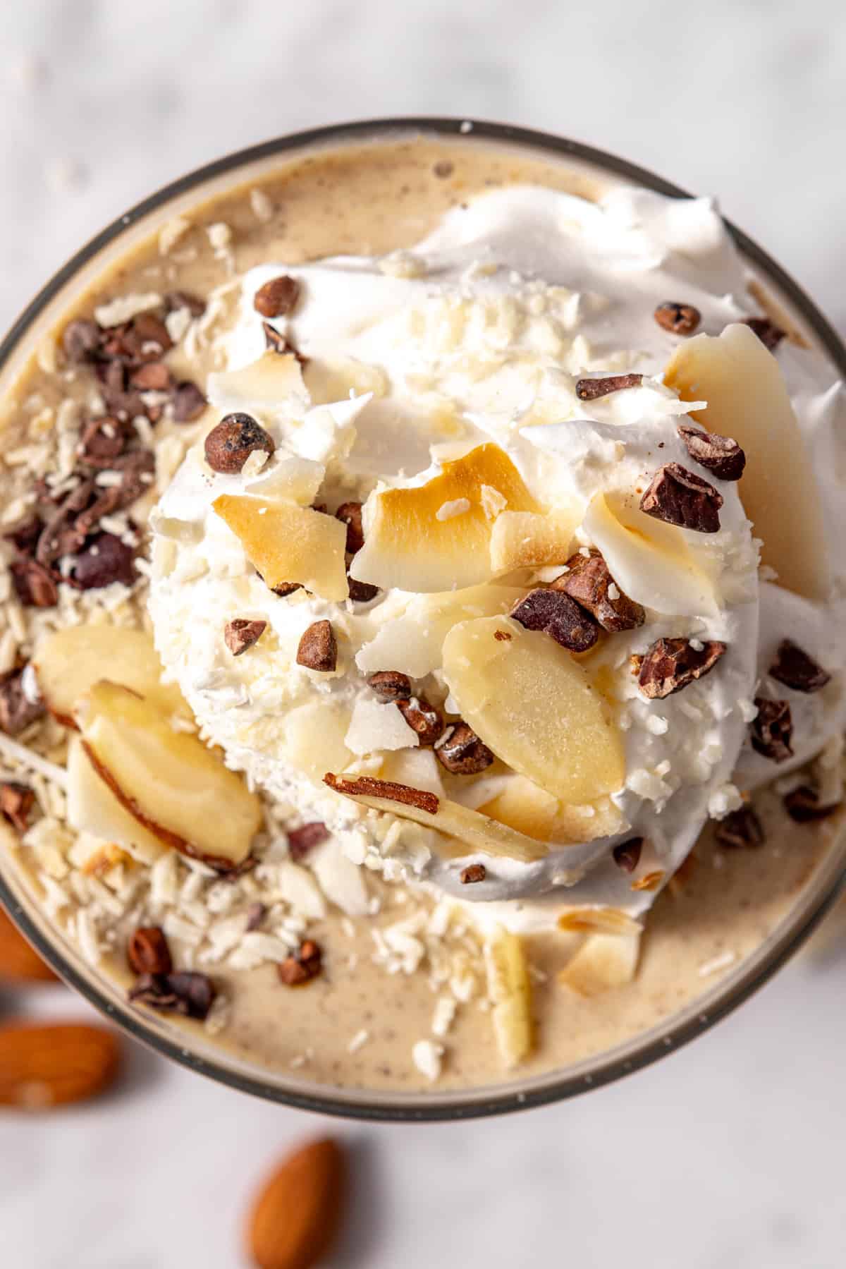 Pour into a glass and top with extra cacao nibs and coconut flakes for that almond joy-inspired finish.
