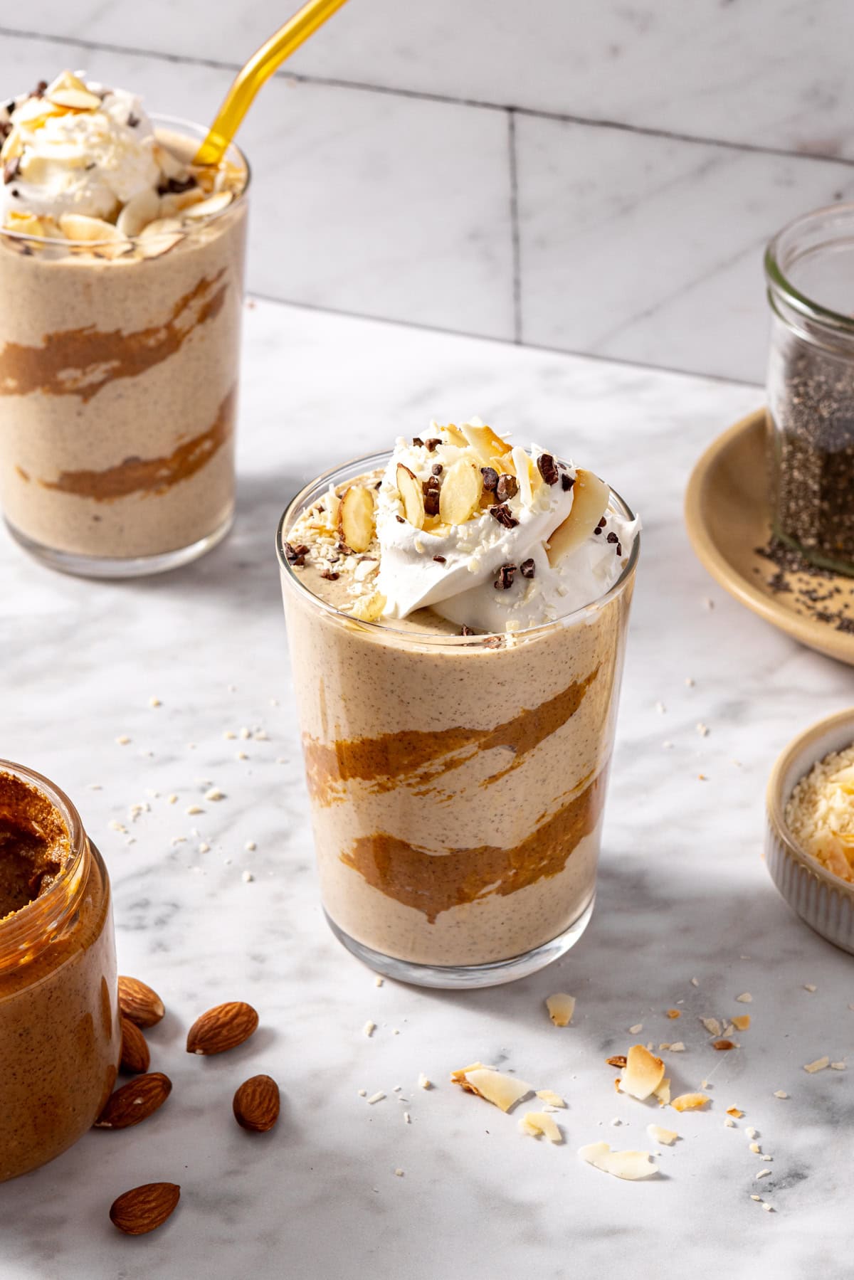 Add the banana, ice, date, almond butter, protein powder, chia seeds, vanilla, yogurt, and coconut milk. - Blend until smooth and creamy.