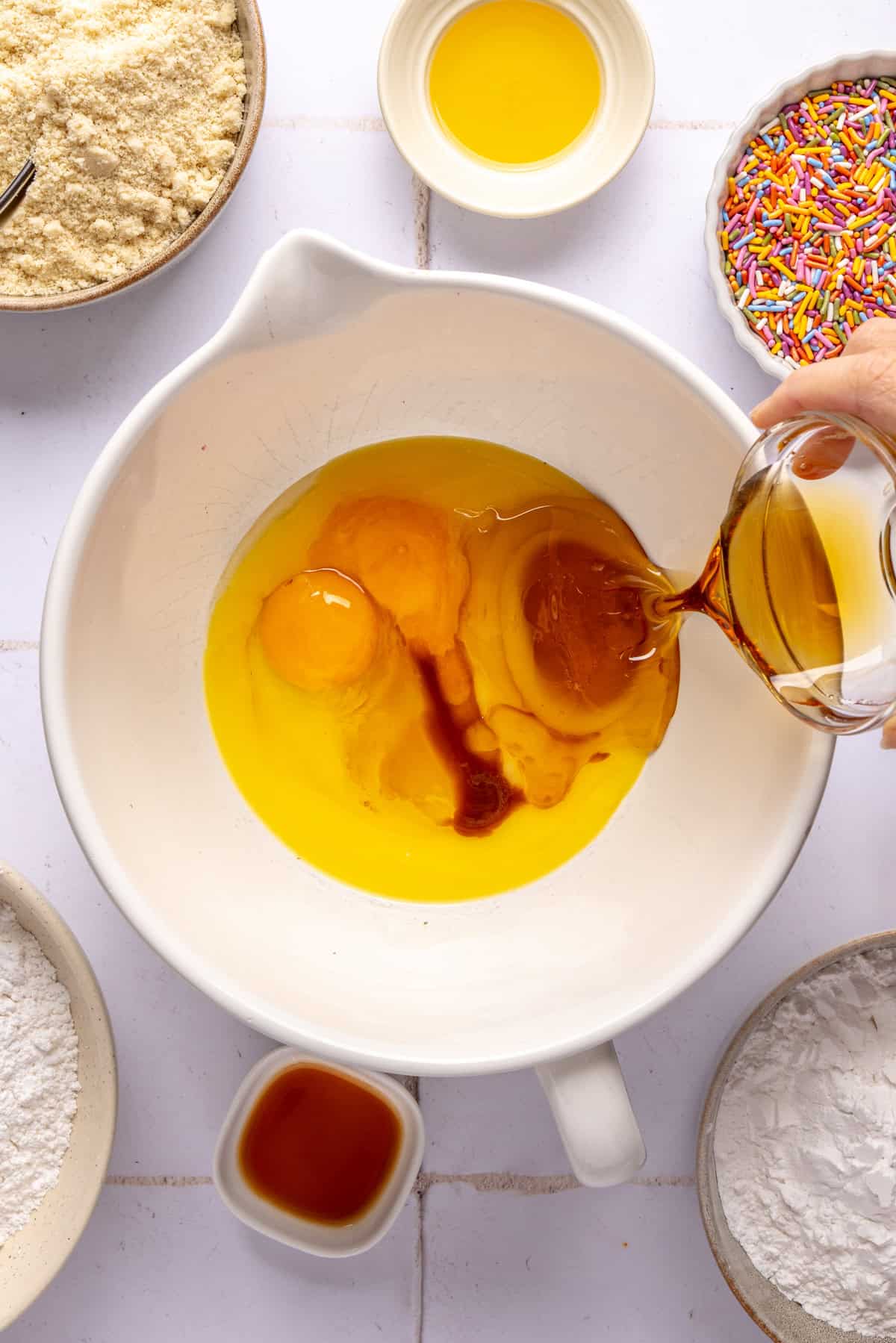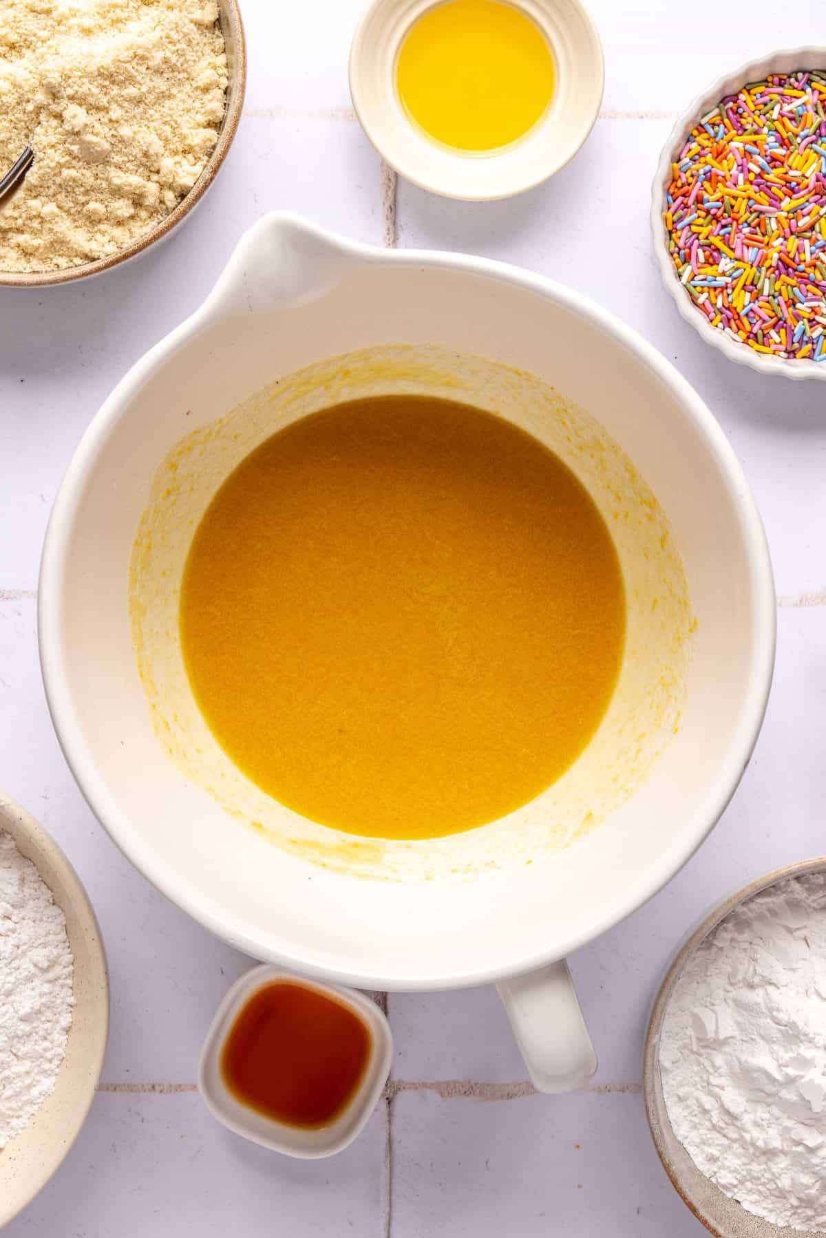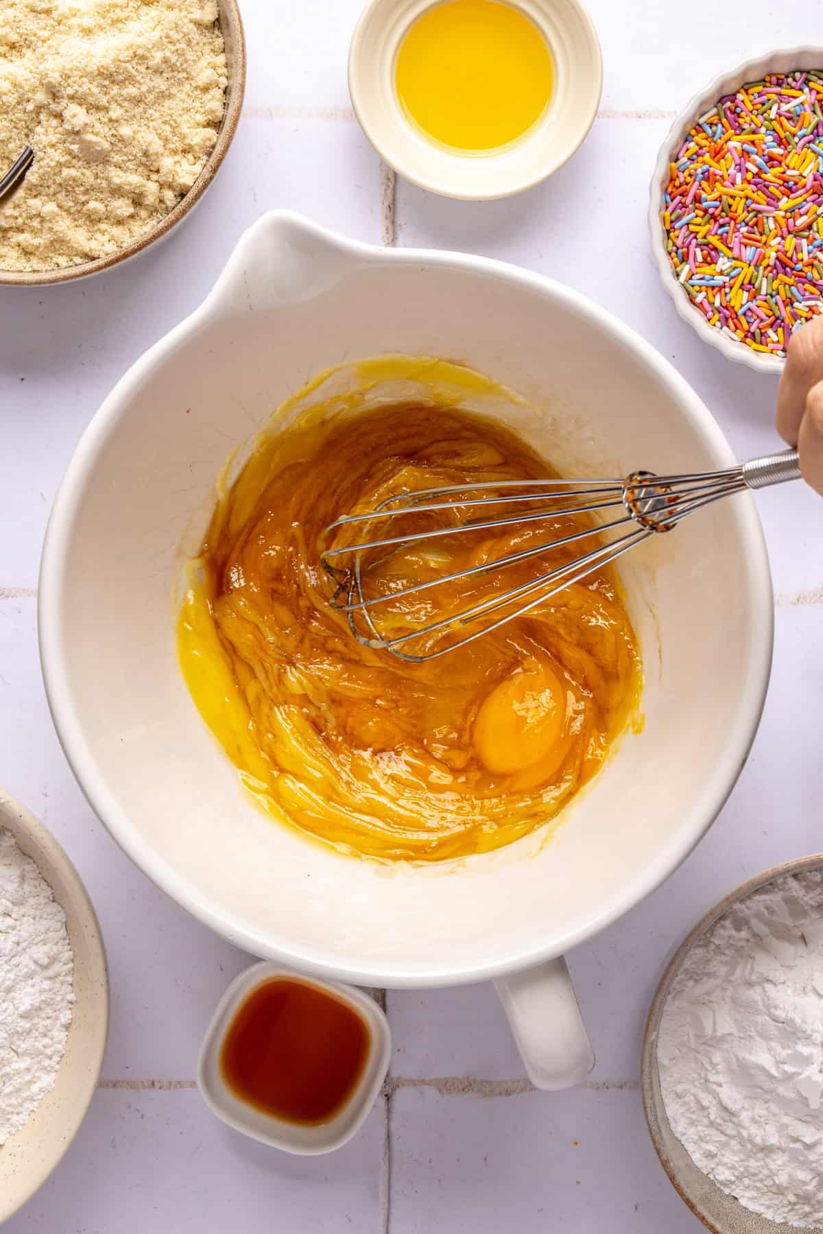 • In a large mixing bowl, whisk together the melted and cooled ghee, maple syrup, egg, egg yolk, vanilla, and almond extract for about 1 minute, until the mixture looks glossy and fully emulsified.