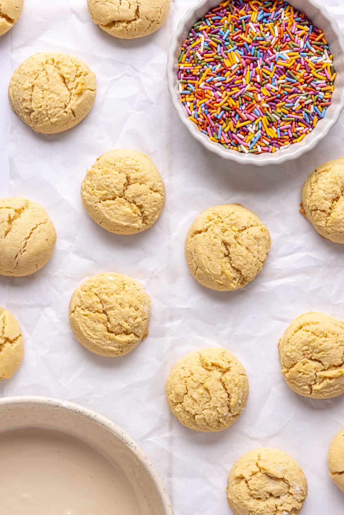 Top paleo-style cookies with shredded coconut or crushed freeze-dried fruit; use dye-free sprinkles for the frosted version.