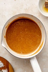 - Combine almond butter, coconut oil, vanilla, maple syrup and sea salt in a saucepan over the stove on medium-low heat and heat until completely liquified, whisking together, about 2-3 minutes.