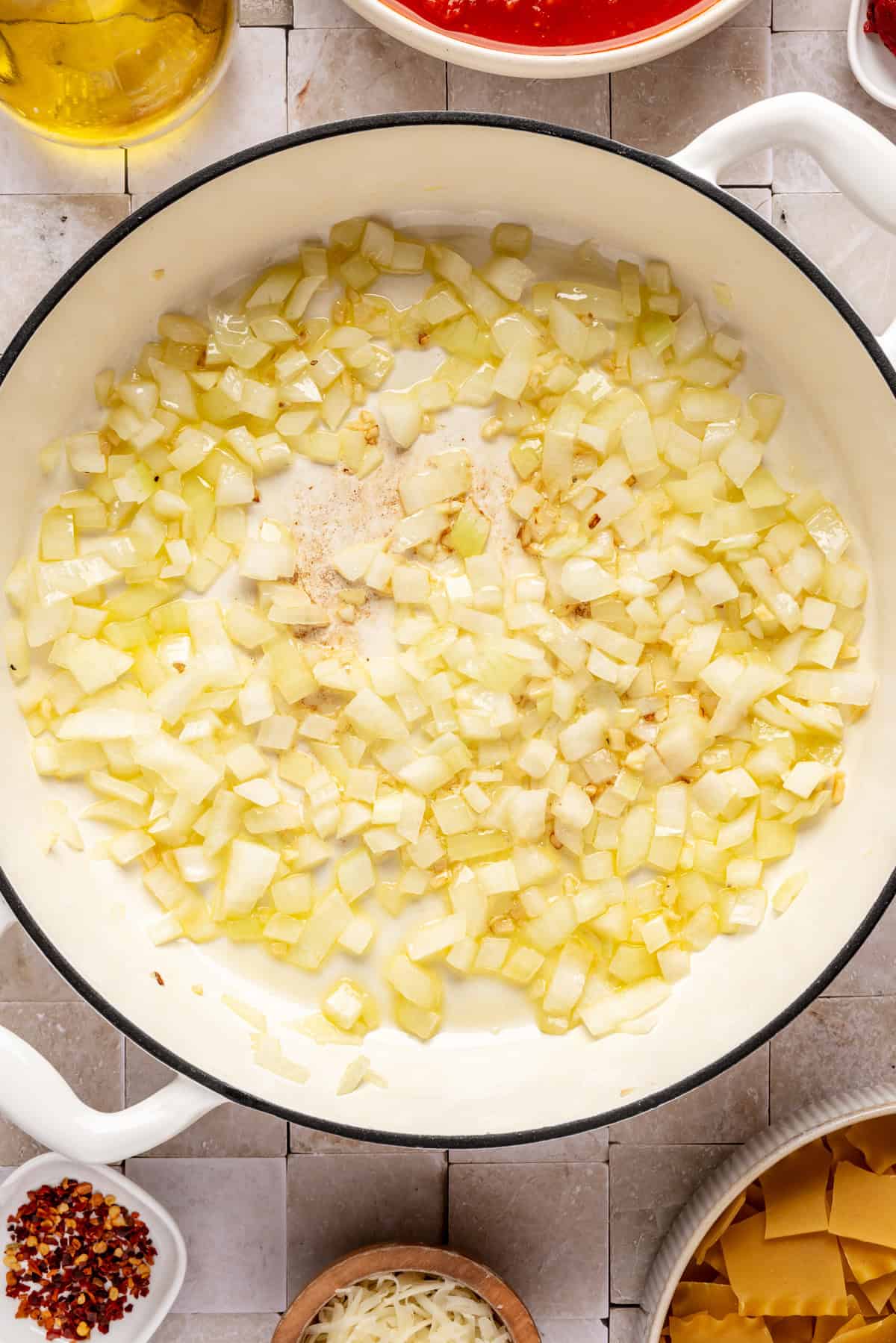Add the onion and garlic and cook for 3–4 minutes, stirring occasionally, until the onion begins to soften.