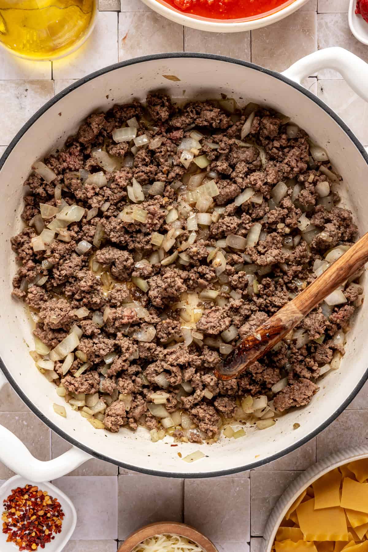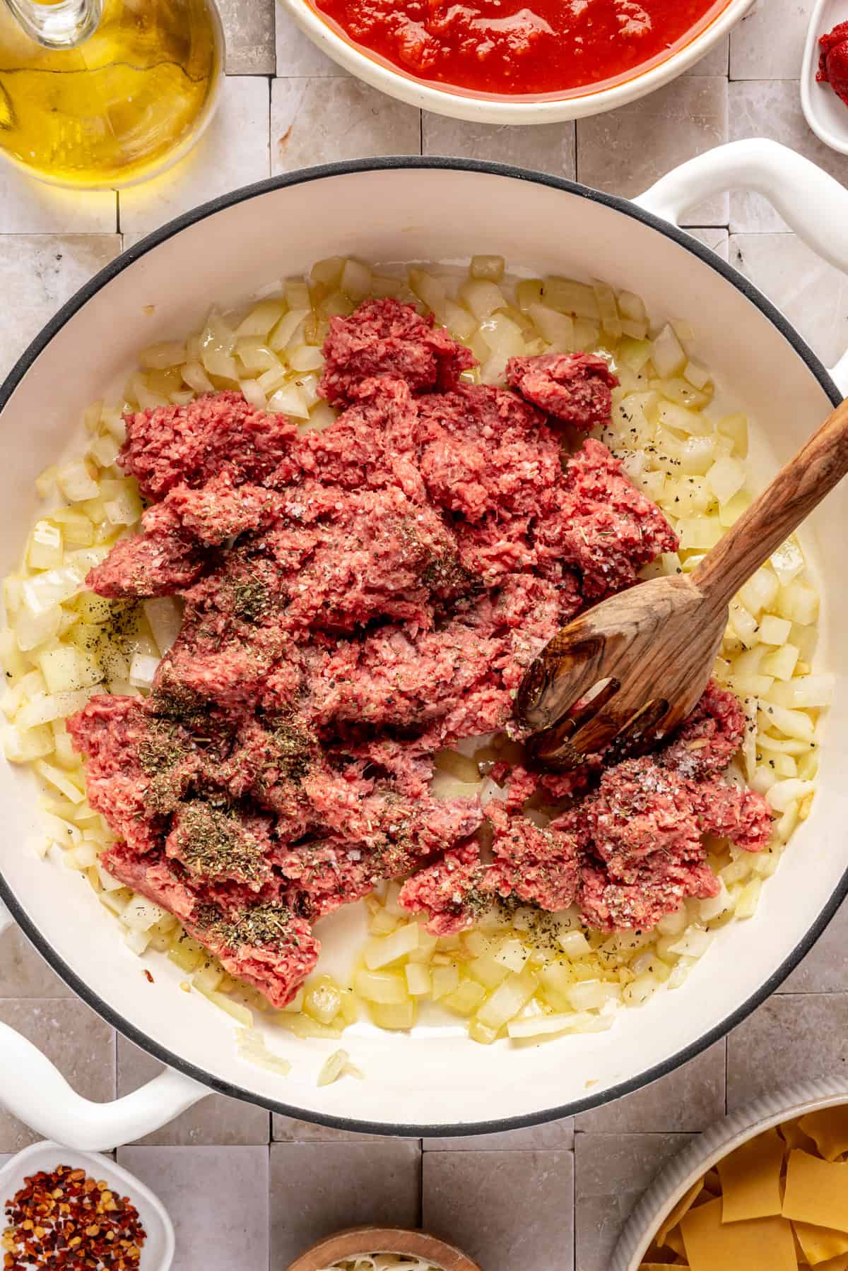Add the ground beef, Italian seasoning, ½ teaspoon salt, and pepper. Use a wooden spoon or meat masher to break the meat into small crumbles.