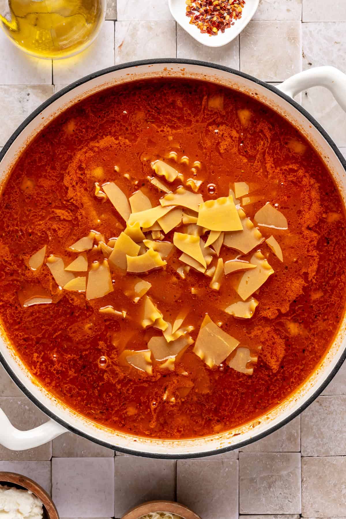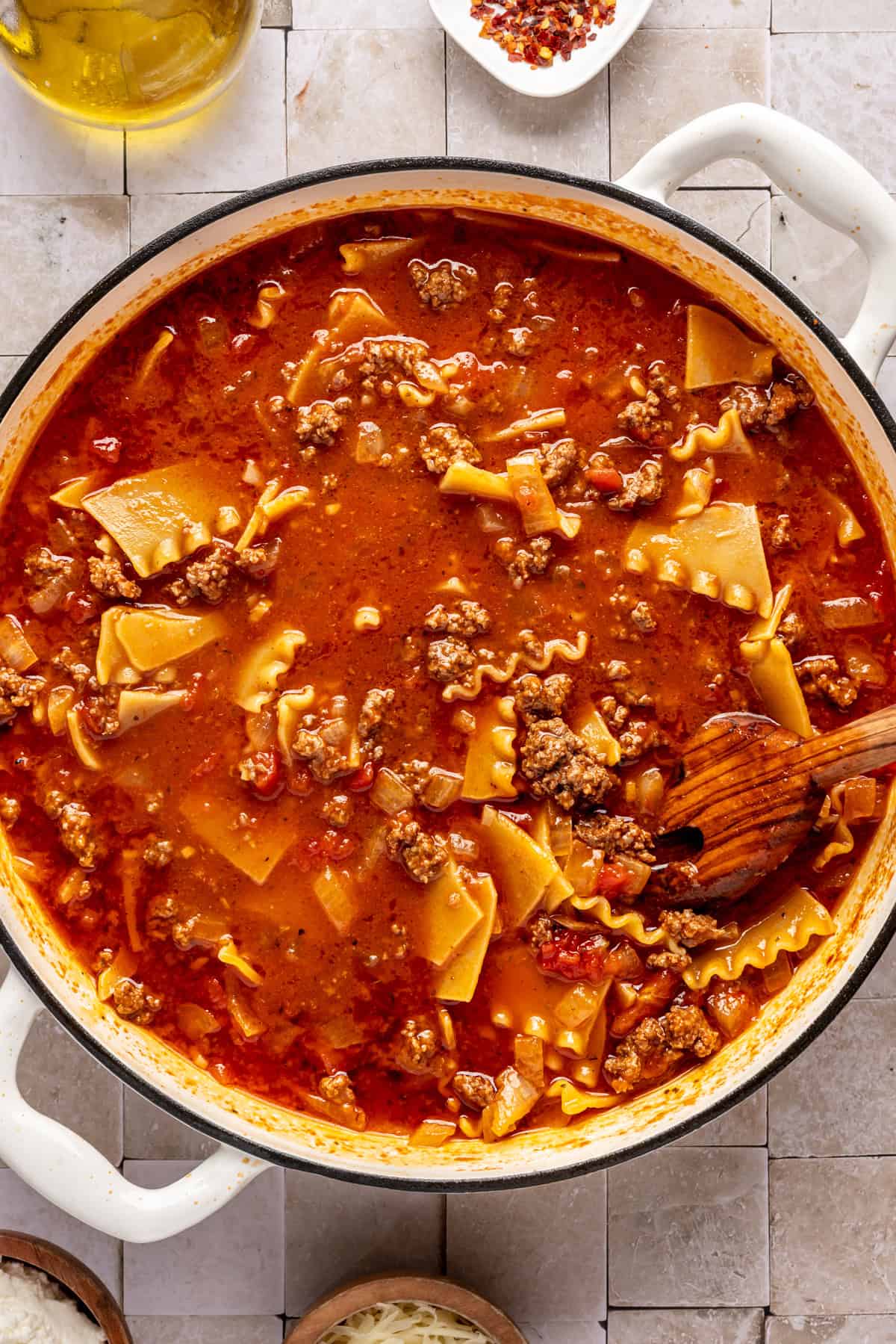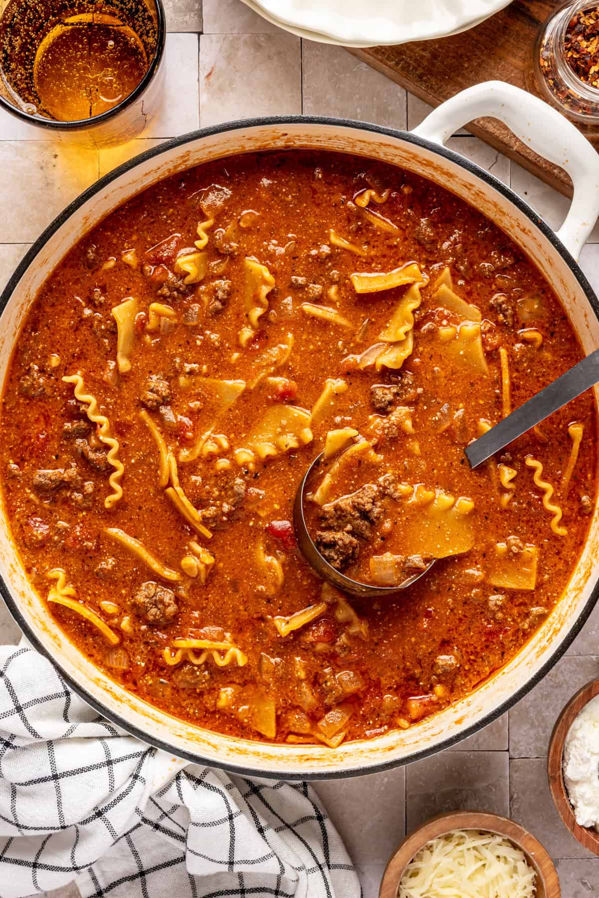To avoid mushy noodles, simmer them just until al dente (usually 15–18 minutes, but follow the box instructions), and stir every few minutes so they don’t stick. If you’re planning to meal prep lasagna soup, store the noodles separately and add them when reheating, or simply stir in a splash of broth to loosen the texture.