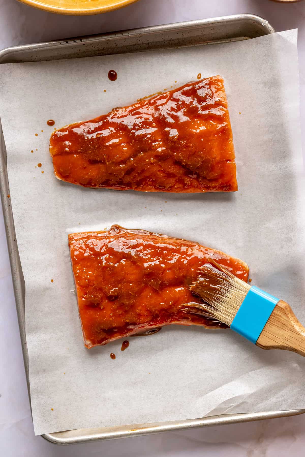 - In a small bowl, whisk together the miso paste, coconut aminos, honey, ginger, and sesame oil. Brush the mixture onto the salmon fillets and place them on a parchment-lined baking sheet. Bake for 12–15 minutes, or until the salmon is cooked through and flakes easily with a fork.