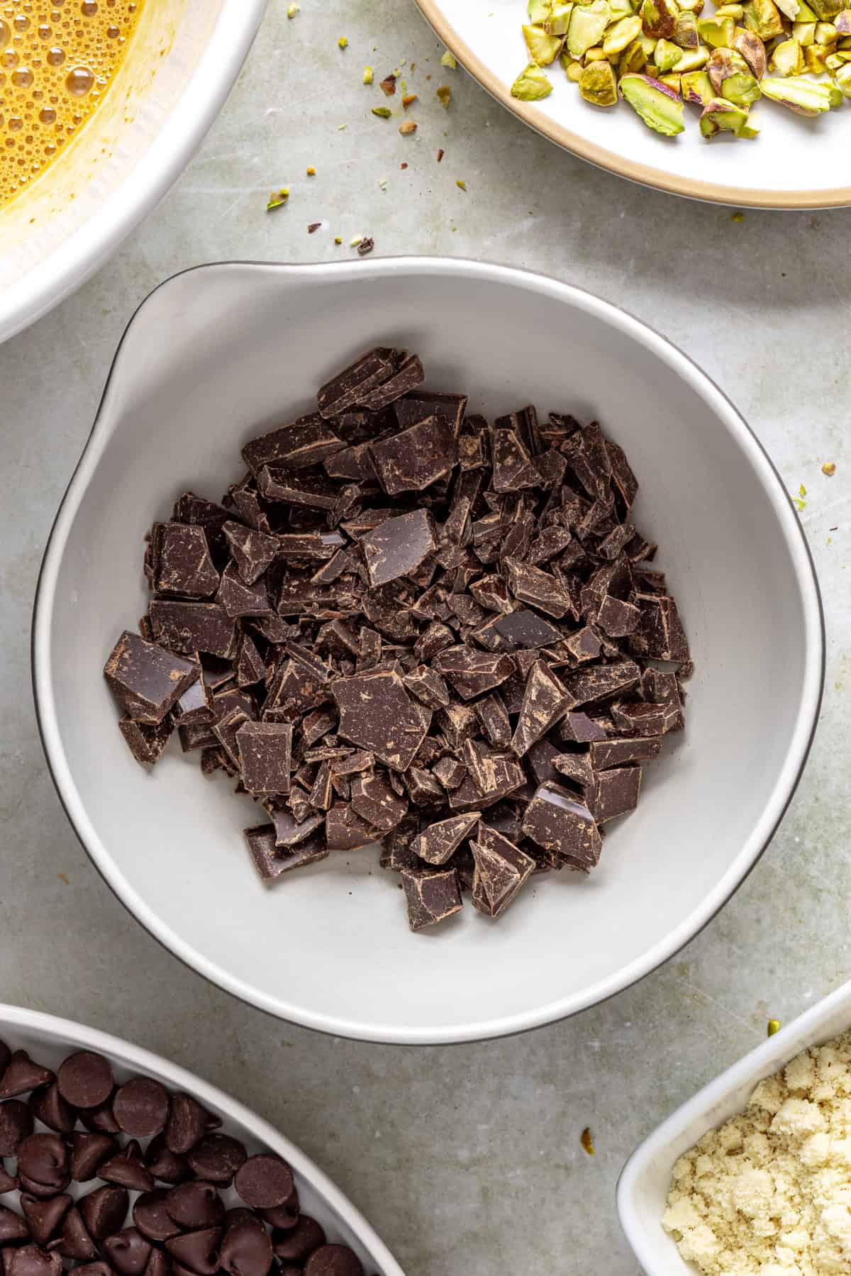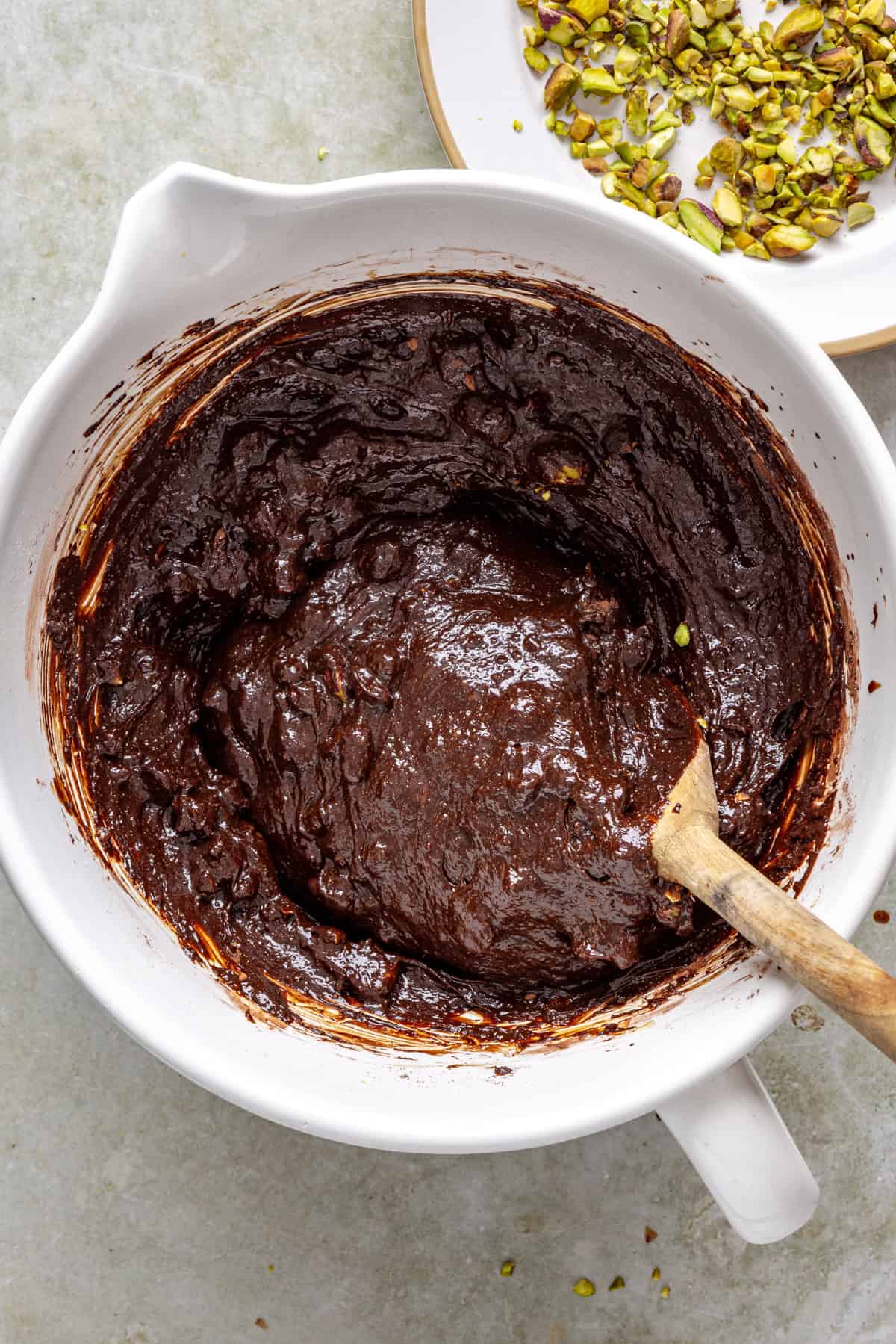 The key to fudgy pistachio brownies is using enough fat and chocolate while avoiding too much flour. In this recipe, avocado oil and melted dark chocolate create a rich base, while almond flour keeps the texture tender without drying the brownies out. Whisking the eggs well also helps give the brownies structure while keeping the center soft.
