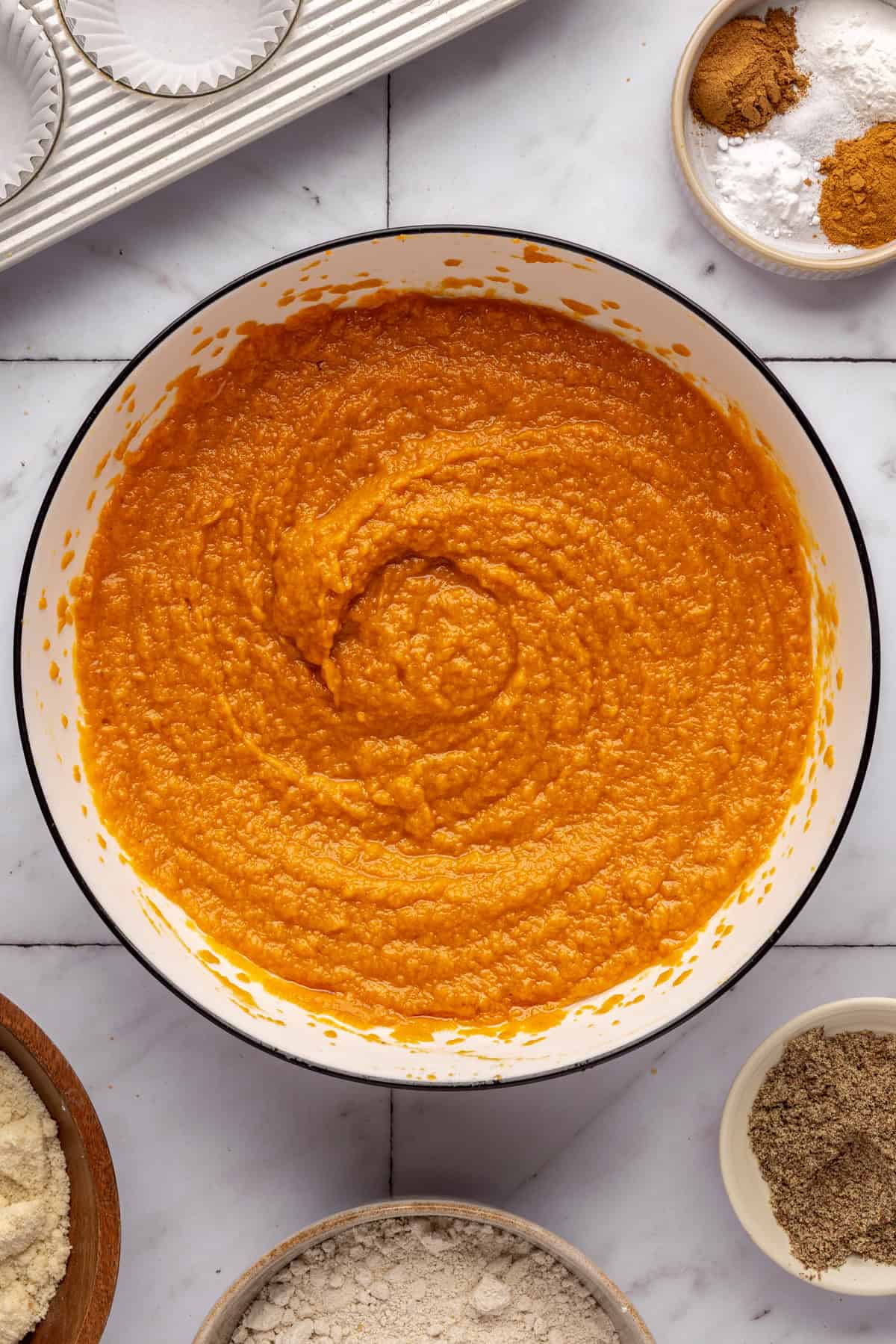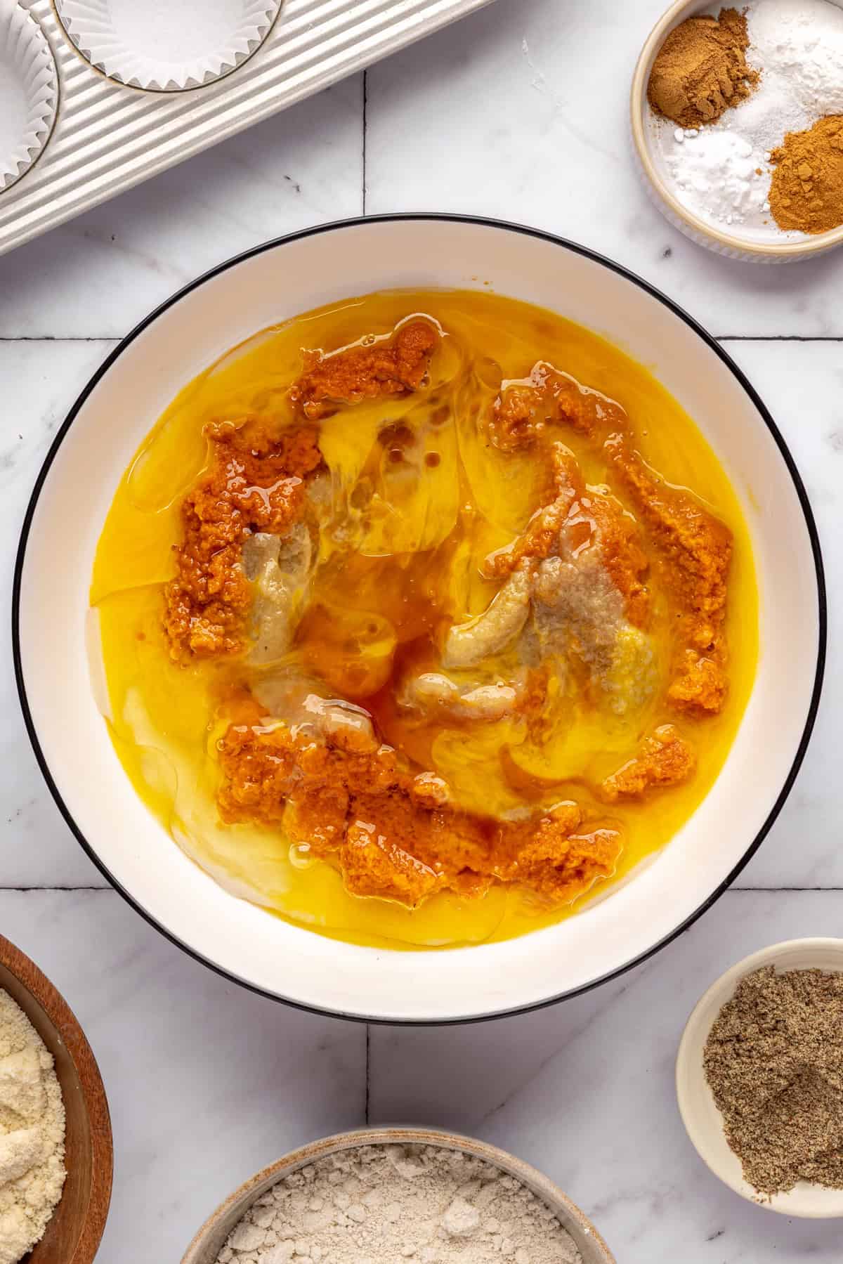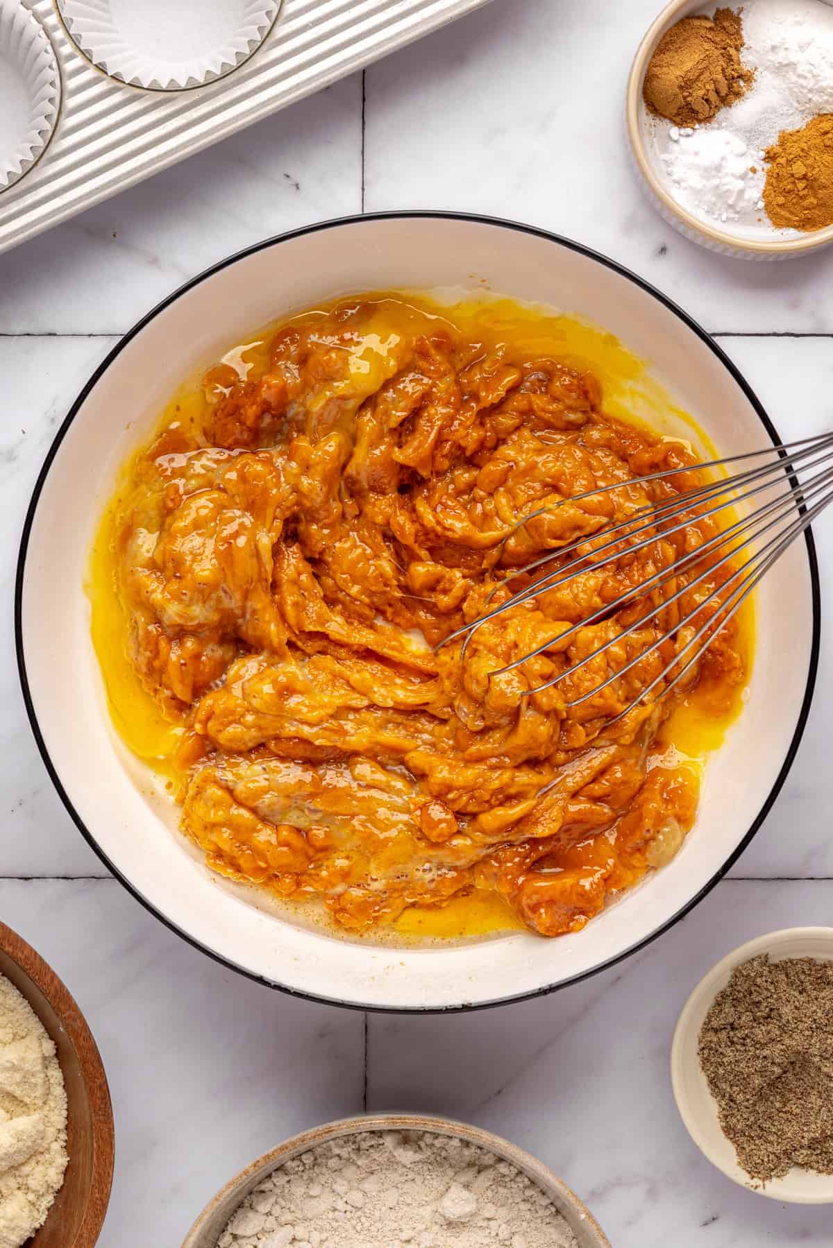 • In a medium bowl, whisk together the pumpkin purée, eggs, applesauce* (adjust if using mashed banana add-in), oil, vanilla, and any optional add-ins such as mashed banana, maple syrup, or collagen. Mix until smooth and slightly frothy.