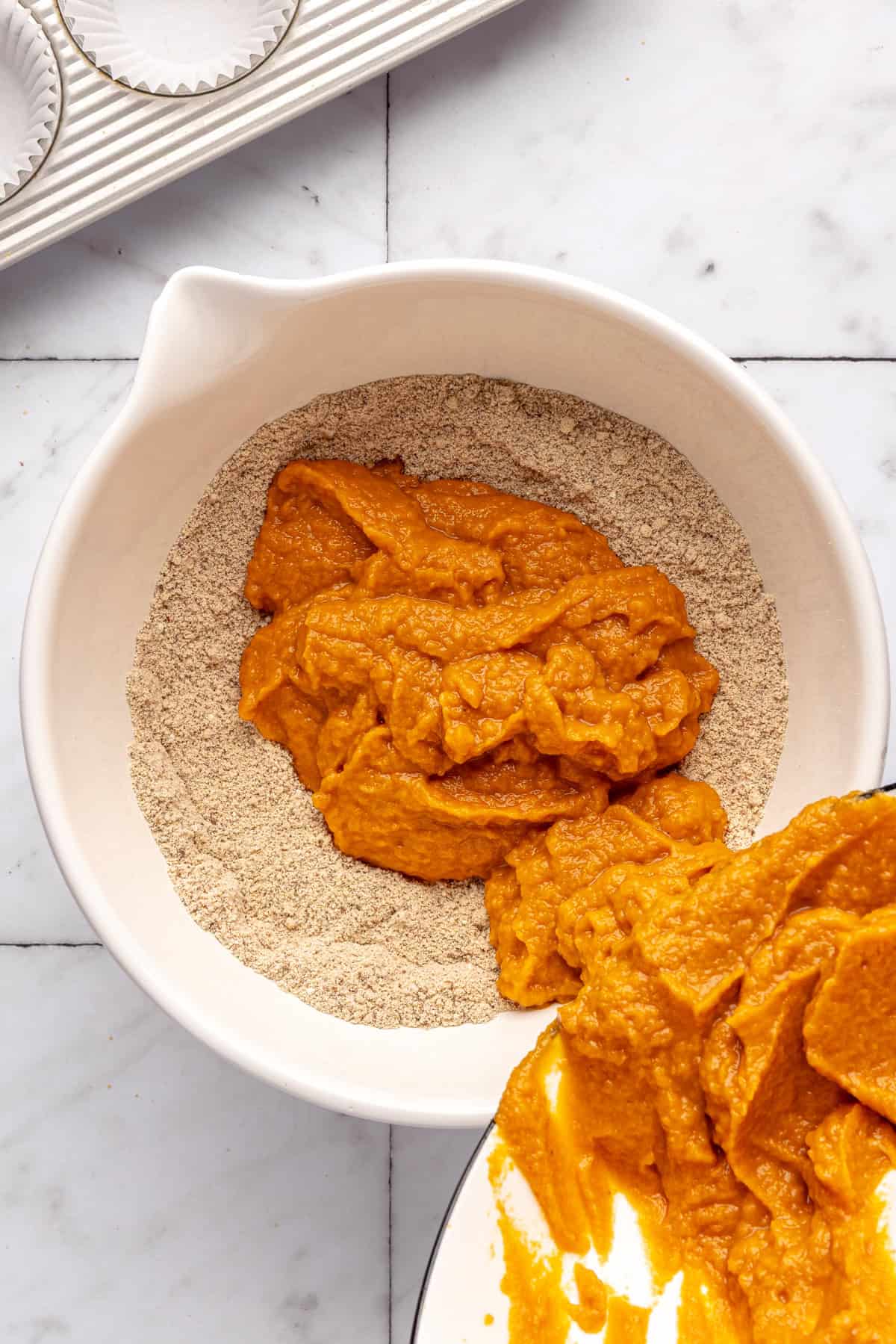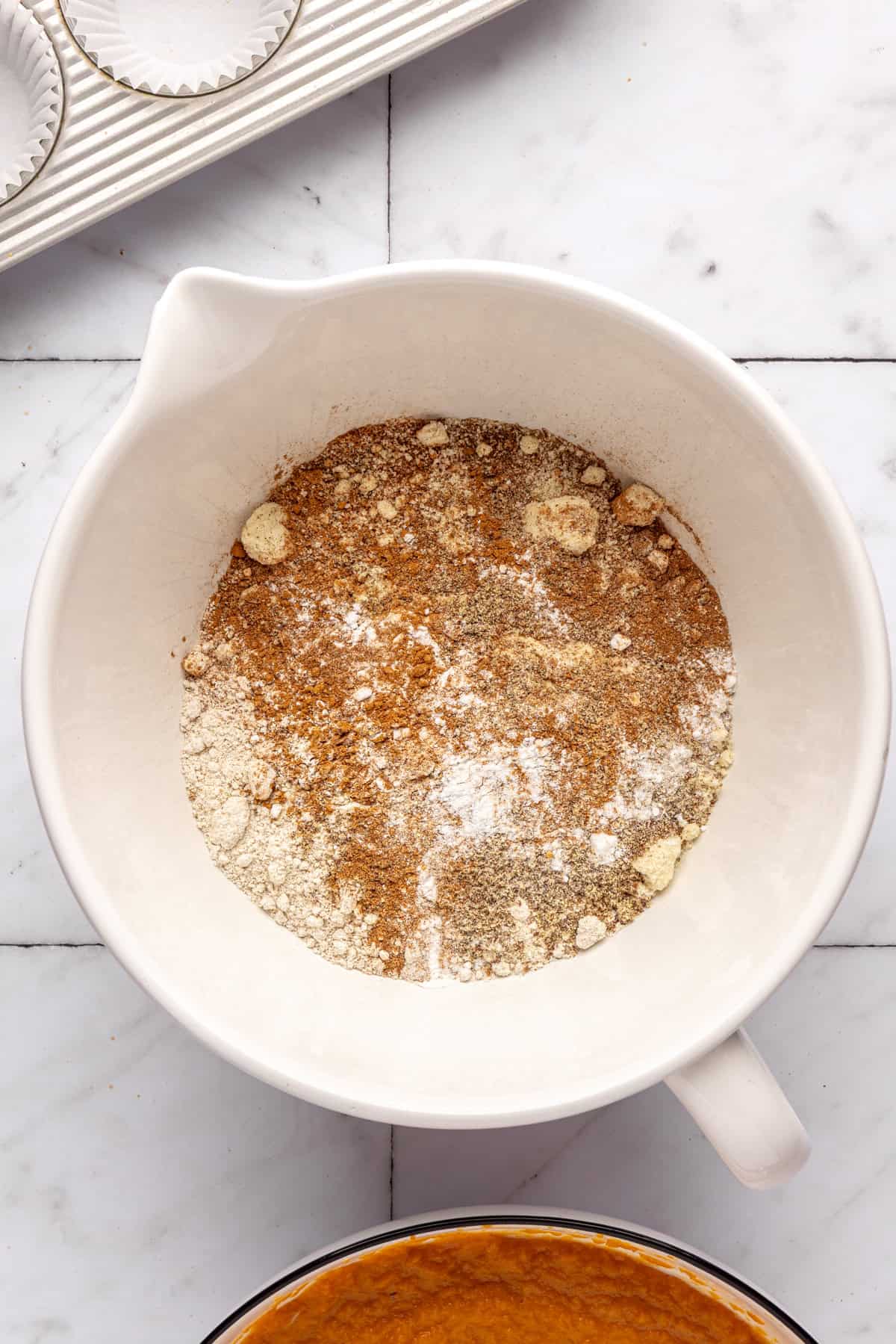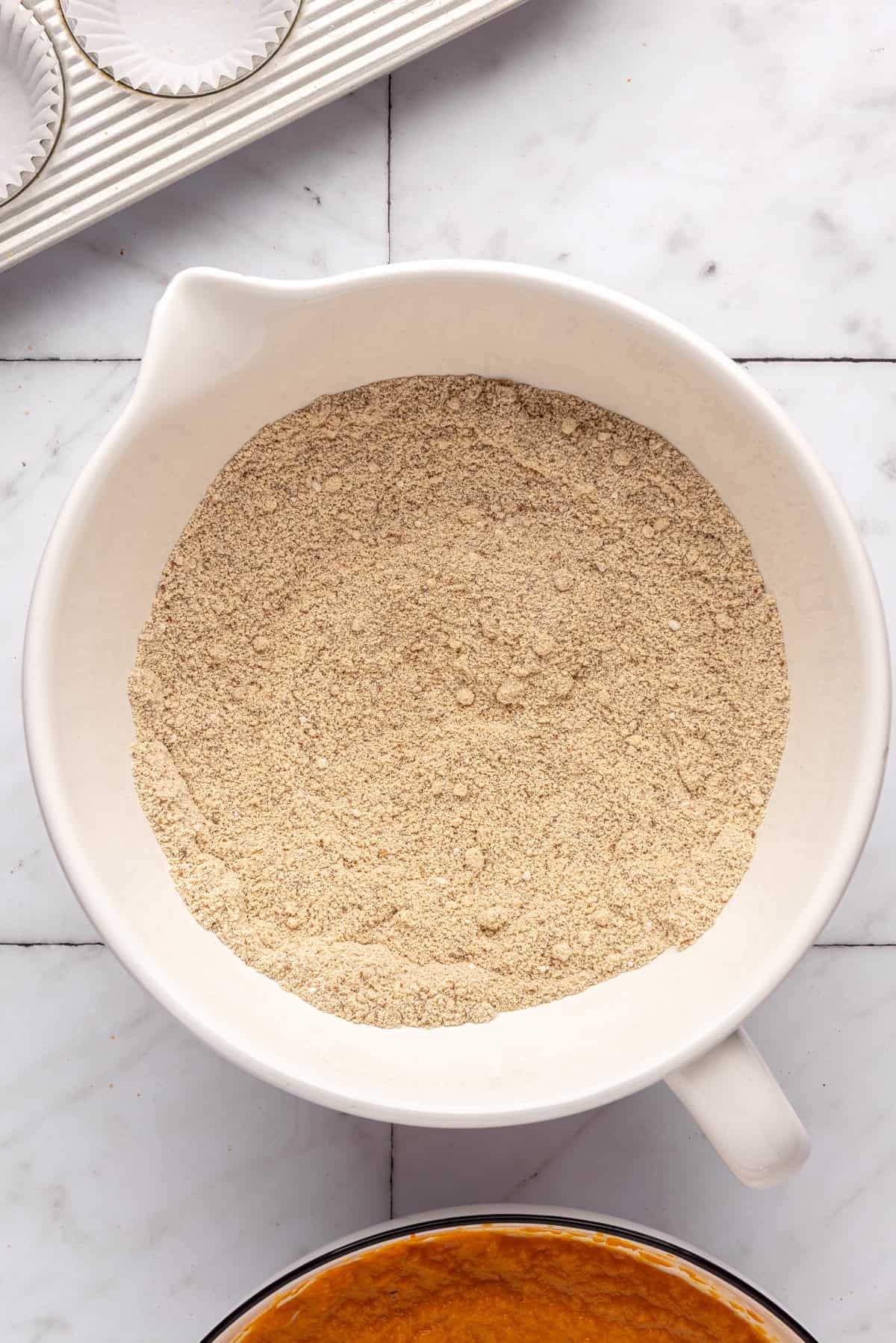 • In a separate large bowl, combine the oat flour, almond flour, ground flaxseed, baking powder, baking soda, cinnamon, pumpkin pie spice, and salt. Stir well to evenly distribute the dry ingredients.