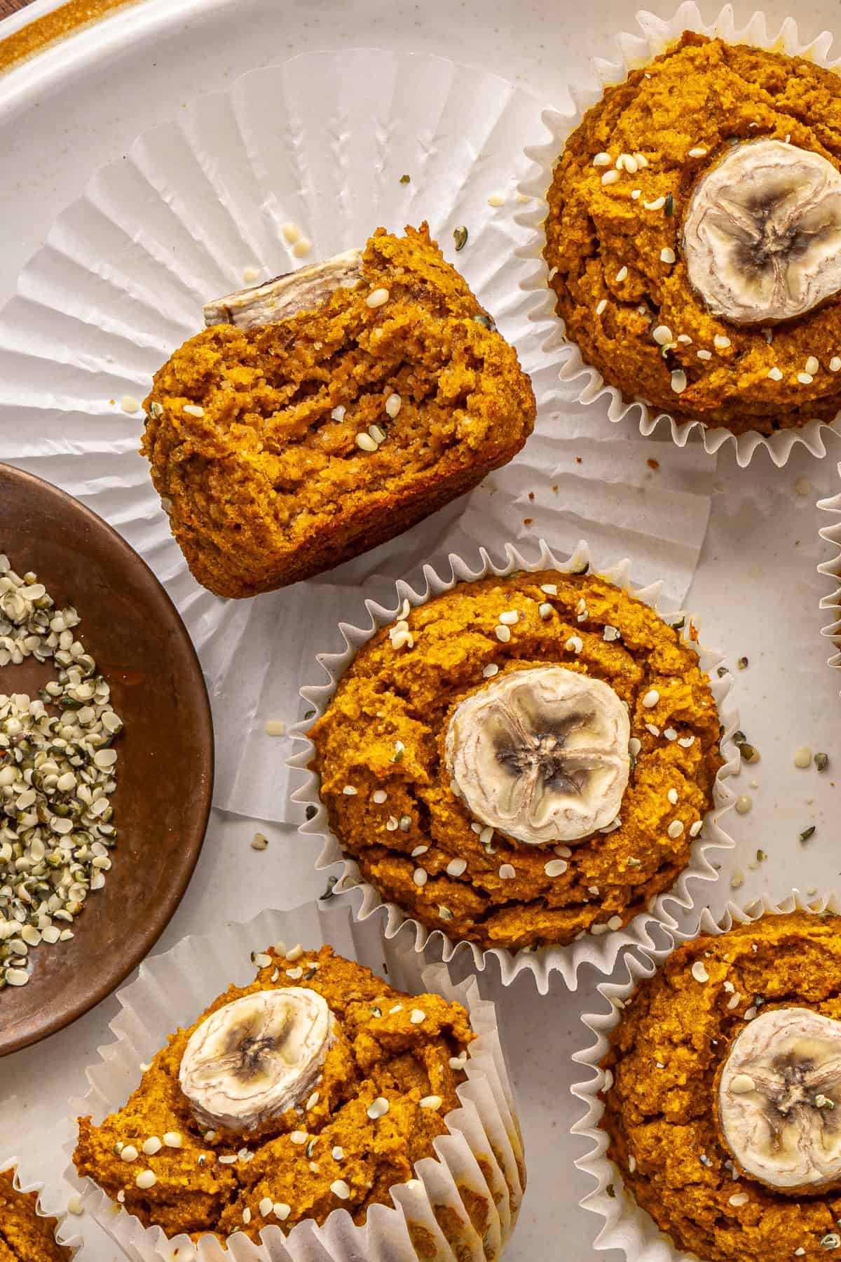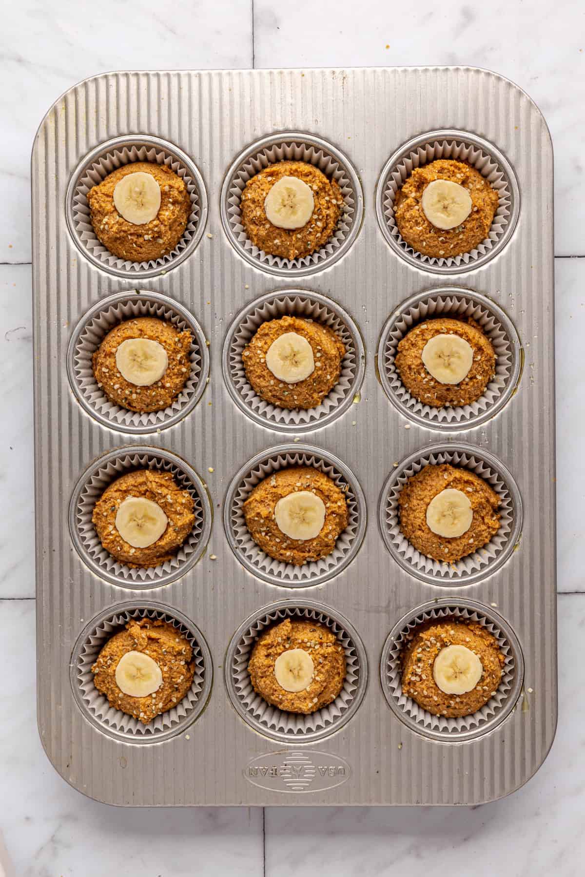 Divide the batter evenly among the 12 muffin cups, filling each about ¾ full. If desired, sprinkle hemp hearts on top or gently press a banana slice into the center of each muffin.
