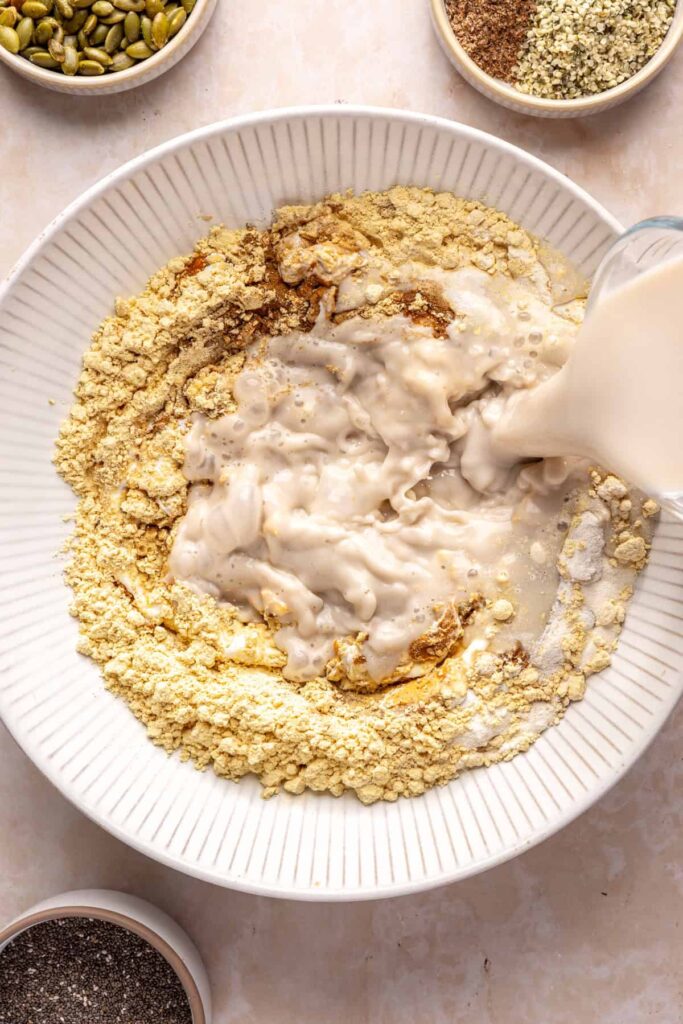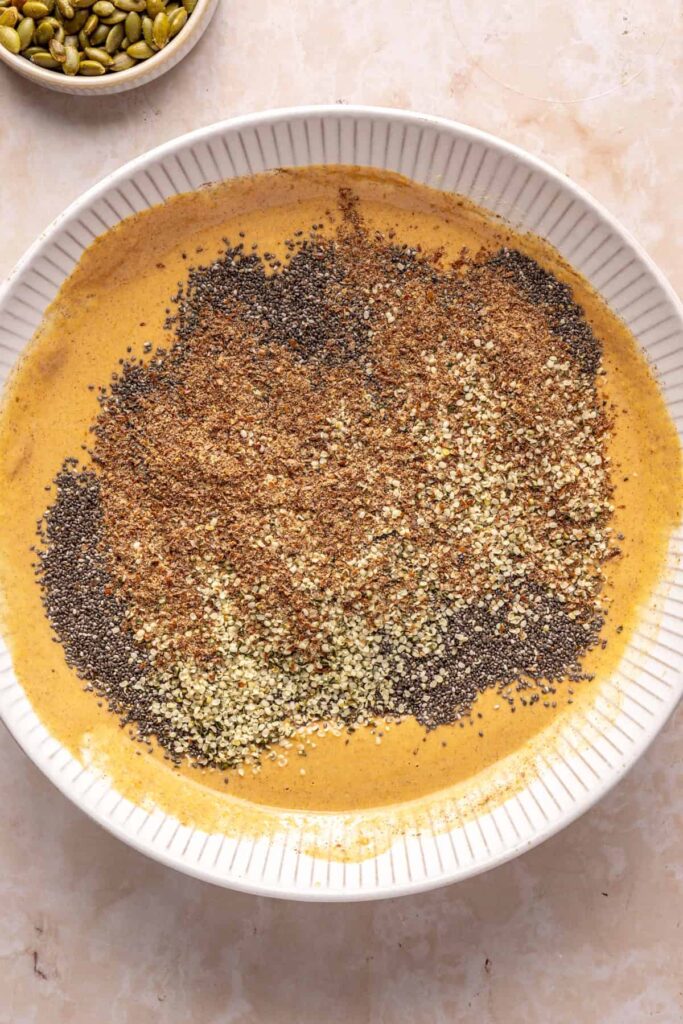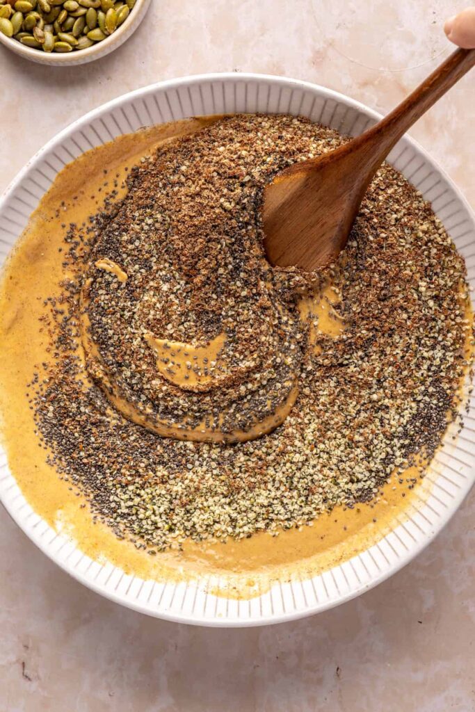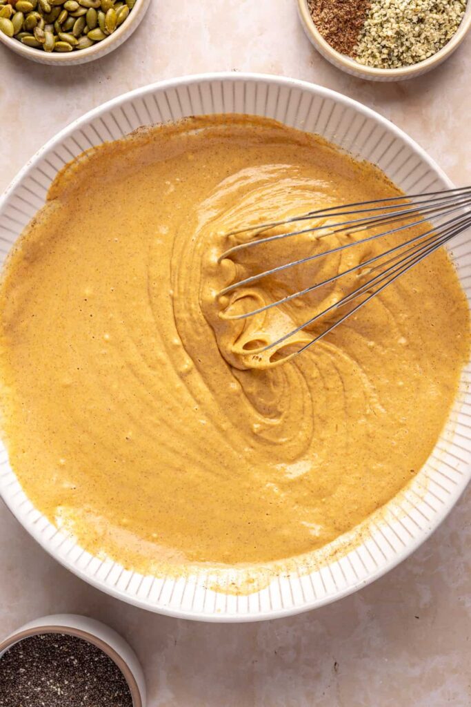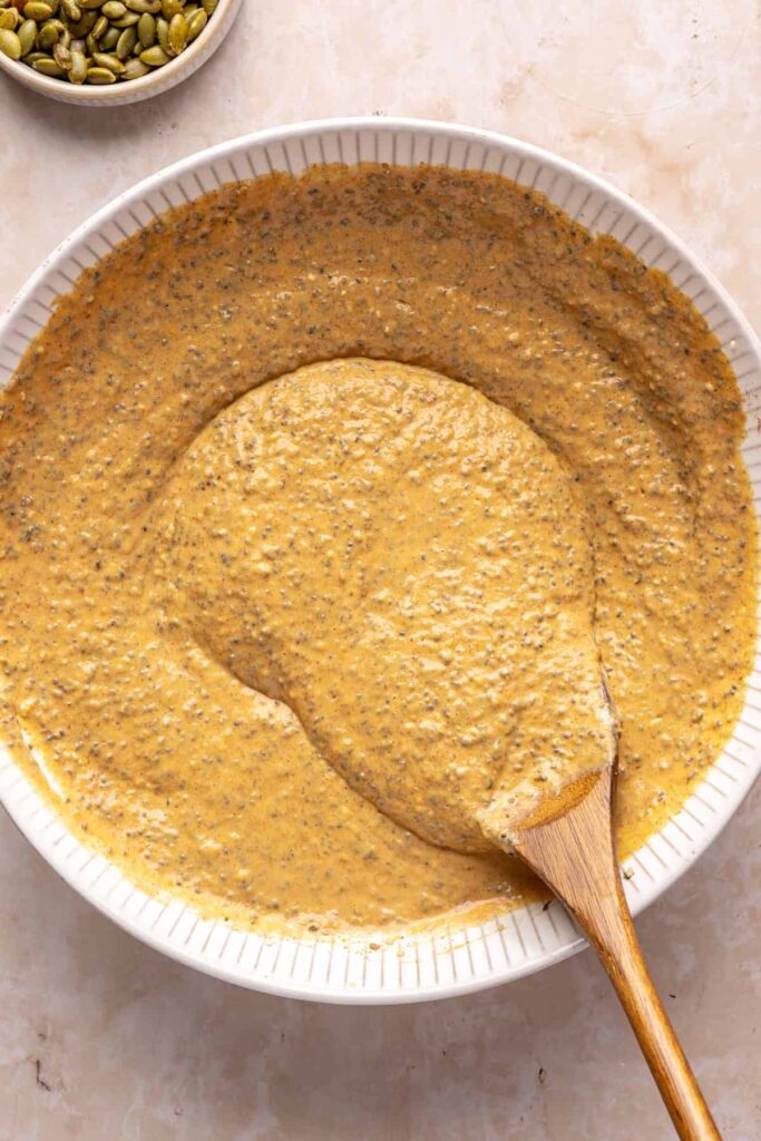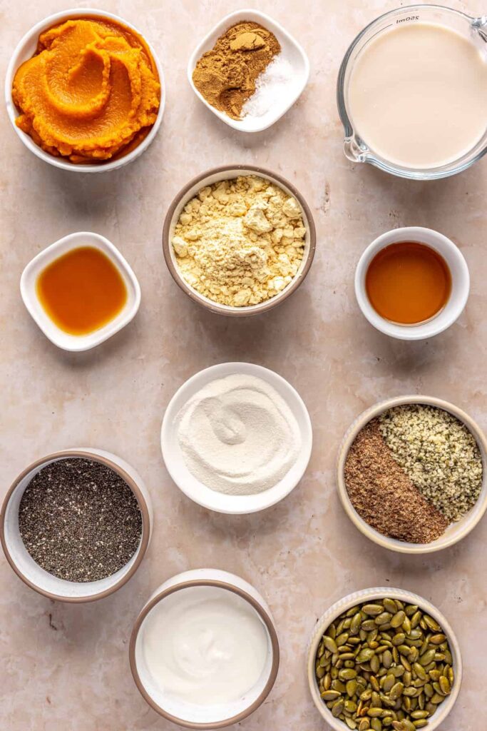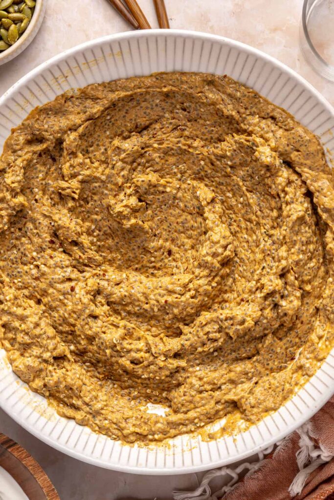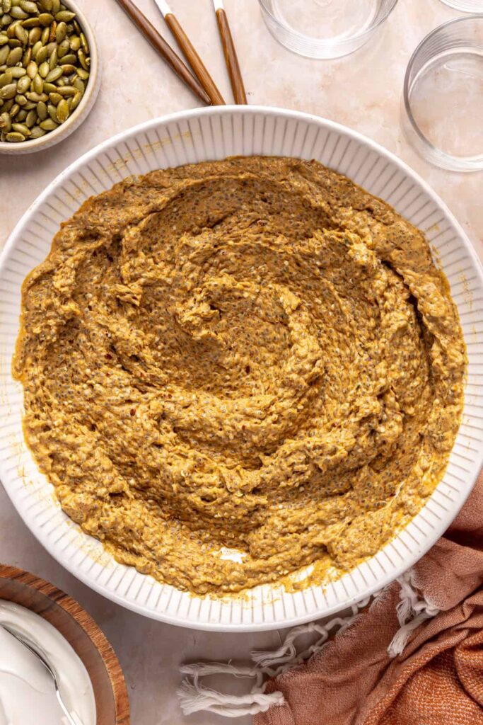 - In a medium bowl, whisk together the pumpkin puree, unsweetened coconut yogurt, cashew milk, vanilla extract, pumpkin pie spice, maple syrup, salt, vanilla protein powder, and collagen peptides. Add the chia seeds, flaxseed meal, and hemp seeds. Stir to combine until the chia seeds are evenly distributed.