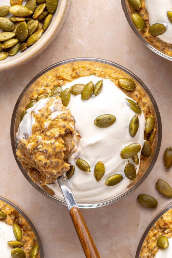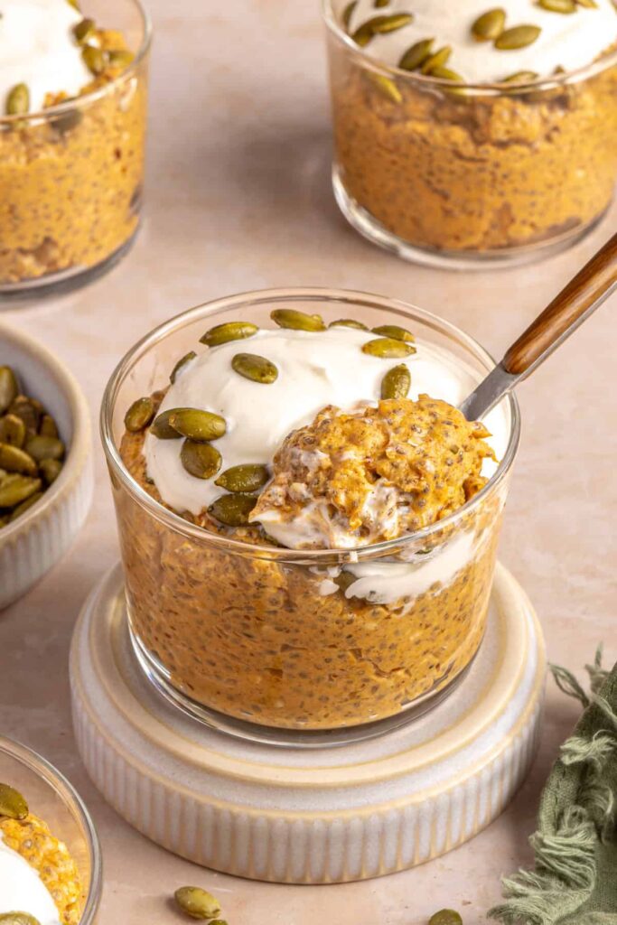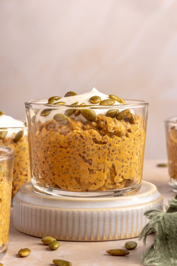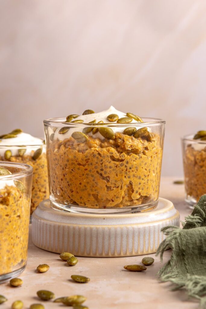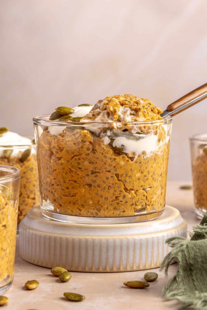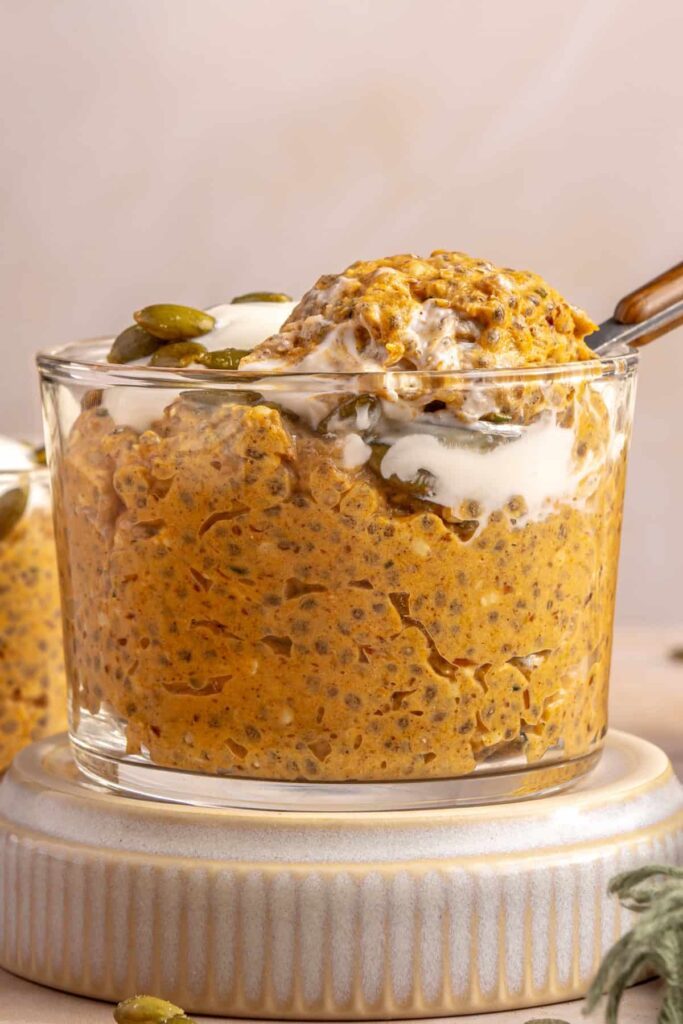 Yes, you can make this pumpkin chia pudding recipe without protein powder. Simply omit it or add an extra tablespoon of chia seeds or flaxseed meal to keep the pudding thick and satisfying. If you want to keep it high-protein, try adding a few spoonfuls of Greek yogurt (depending on dietary preferences) or a scoop of collagen peptides instead.