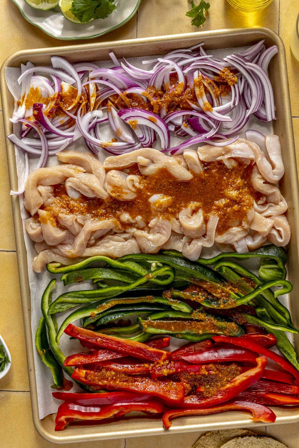 Line a large sheet pan with parchment for easy cleanup. Spread the chicken, red bell pepper, poblano, and red onion in sections in an even layer across the pan.
