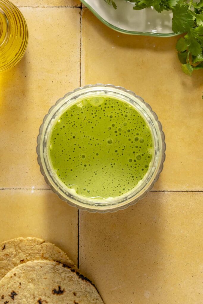 It has a mild to medium kick depending on the jalapeño you use. Removing the seeds keeps it on the milder side. You can always roast an extra jalapeño if you love more heat—or swap it with a milder pepper like Anaheim for a gentler flavor.