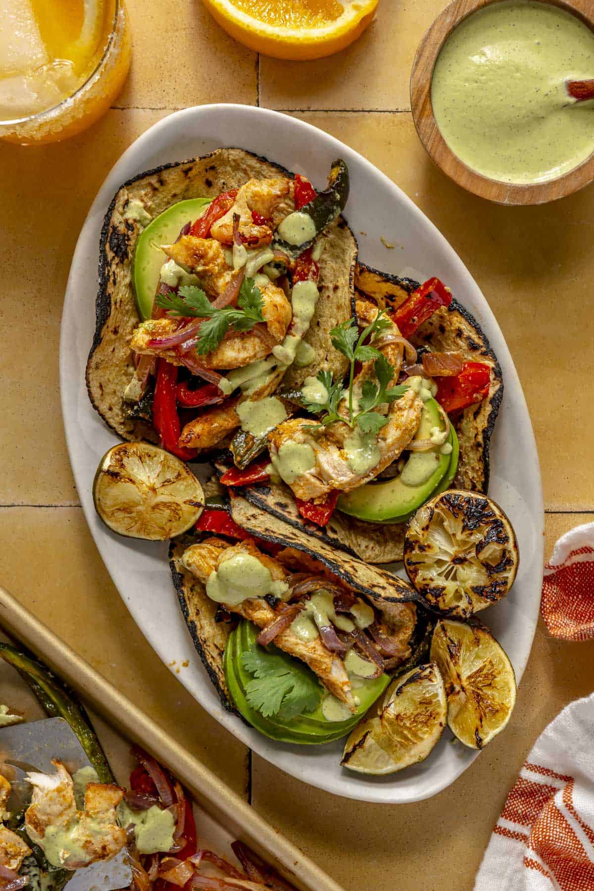 Easy Sheet Pan Chicken Fajitas with Citrus Marinade + Charred Jalapeño Crema (Gluten & Dairy-Free)