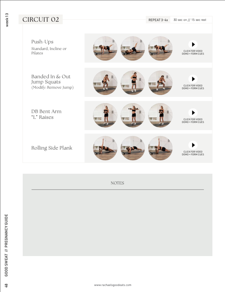 Pulled from Week 13 of my Pregnancy Guide, this one is quick and effective. Modify the workout for your needs, whether that means skipping push-ups altogether or intensifying the workout by opting for standard push-ups instead of Pilates push-ups.
