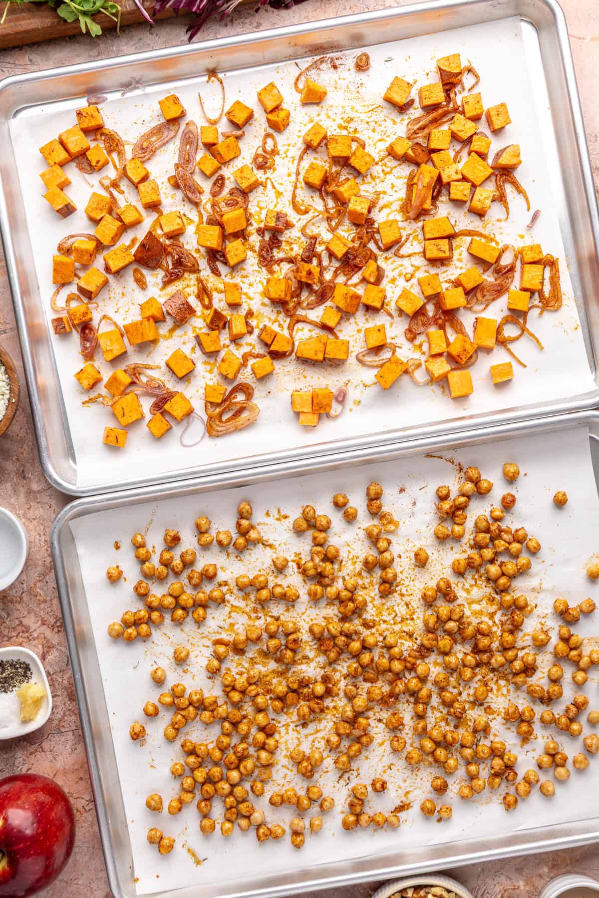 - Transfer both sheets to the oven and roast for 20 minutes. At this point, the chickpeas should be crisp and golden. Remove from the oven.
