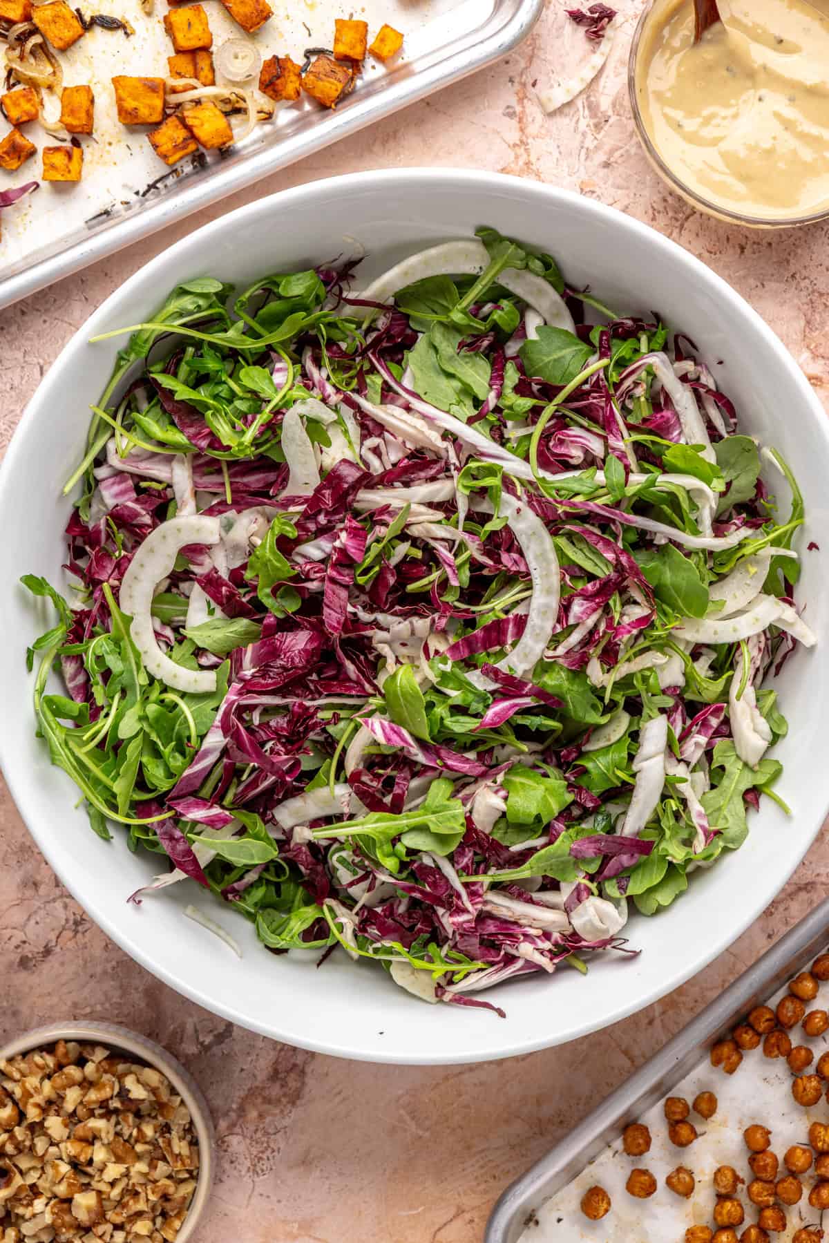 - In a large bowl, add the radicchio, frisee, and shaved fennel.
