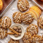 Remove from the fridge. Using a large cookie scoop, portion into 12-14 large cookies. Roll into balls and place 6 cookies on each sheet, spacing at least 2 inches apart. If any of the apples fall out while forming the cookie, press them into the cookie tops. Gently press the tops down slightly using a spatula.