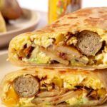 Once pliable, layer in the eggs, sausages, sautéed veggies, avocado, cheese and preferred toppings. To roll like a burrito, fold one side over and then pull back until tightly wrapped around insides. Then, fold both ends under and continue rolling the burrito so there are no openings.